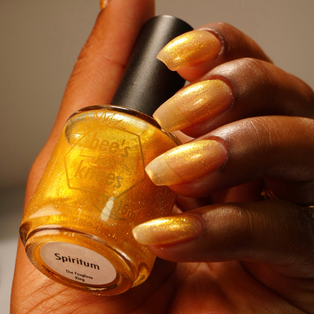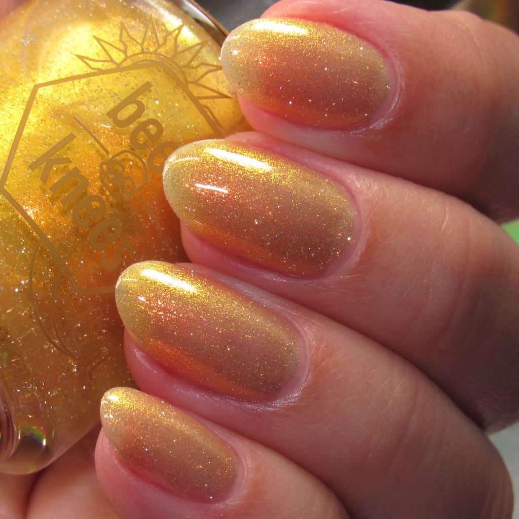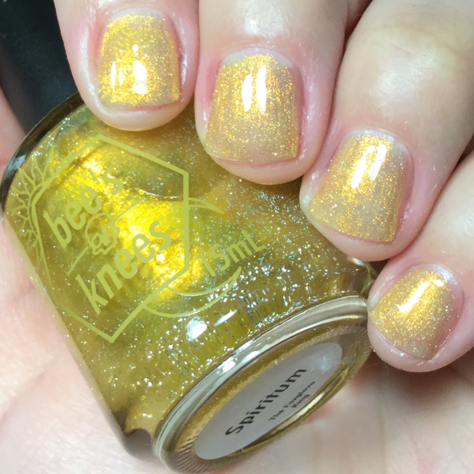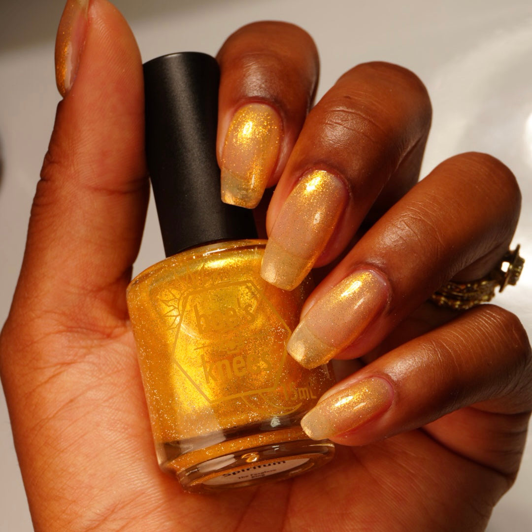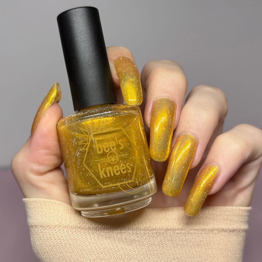 a bright sunny yellow with gold shimmer and a scattering of silver light reflective glitter