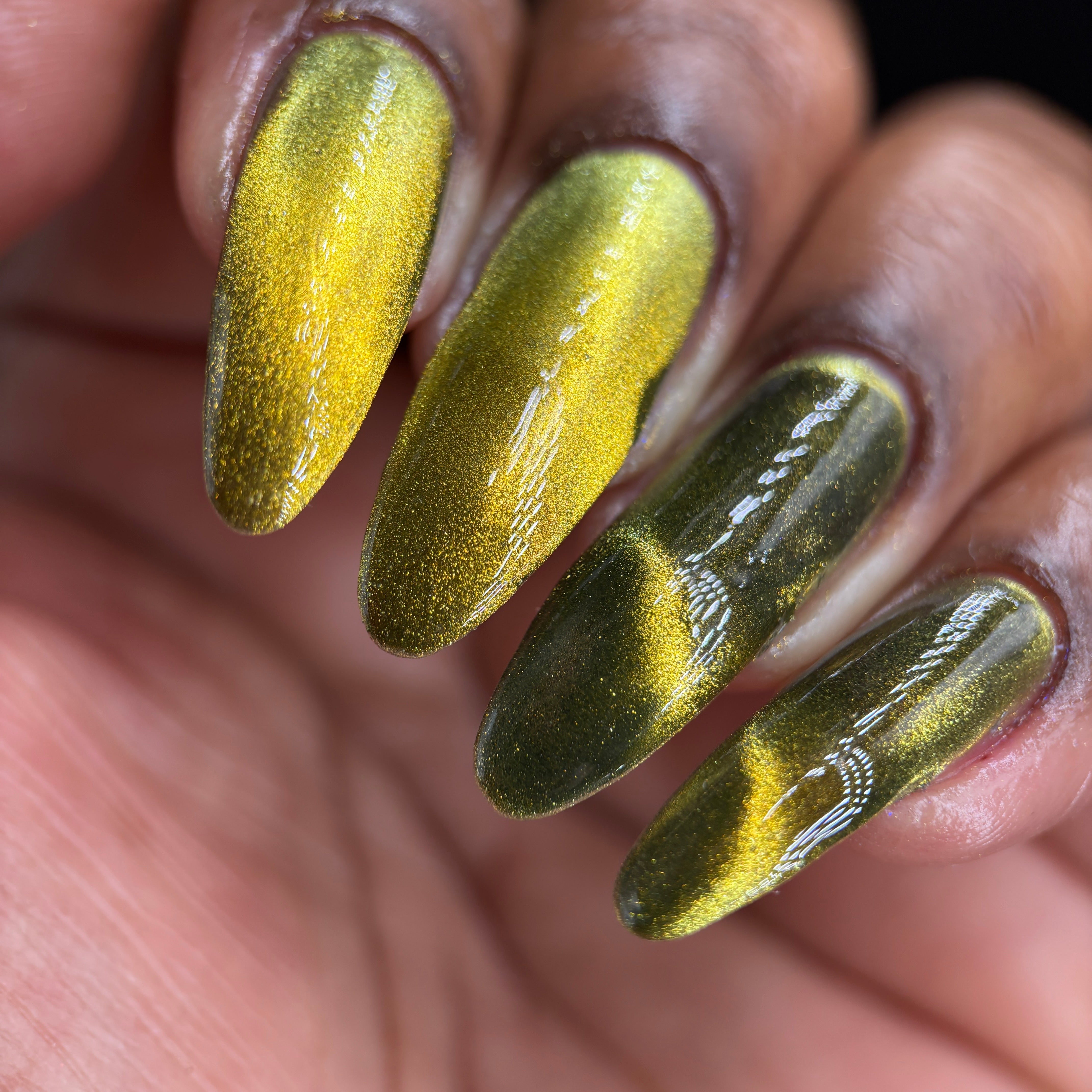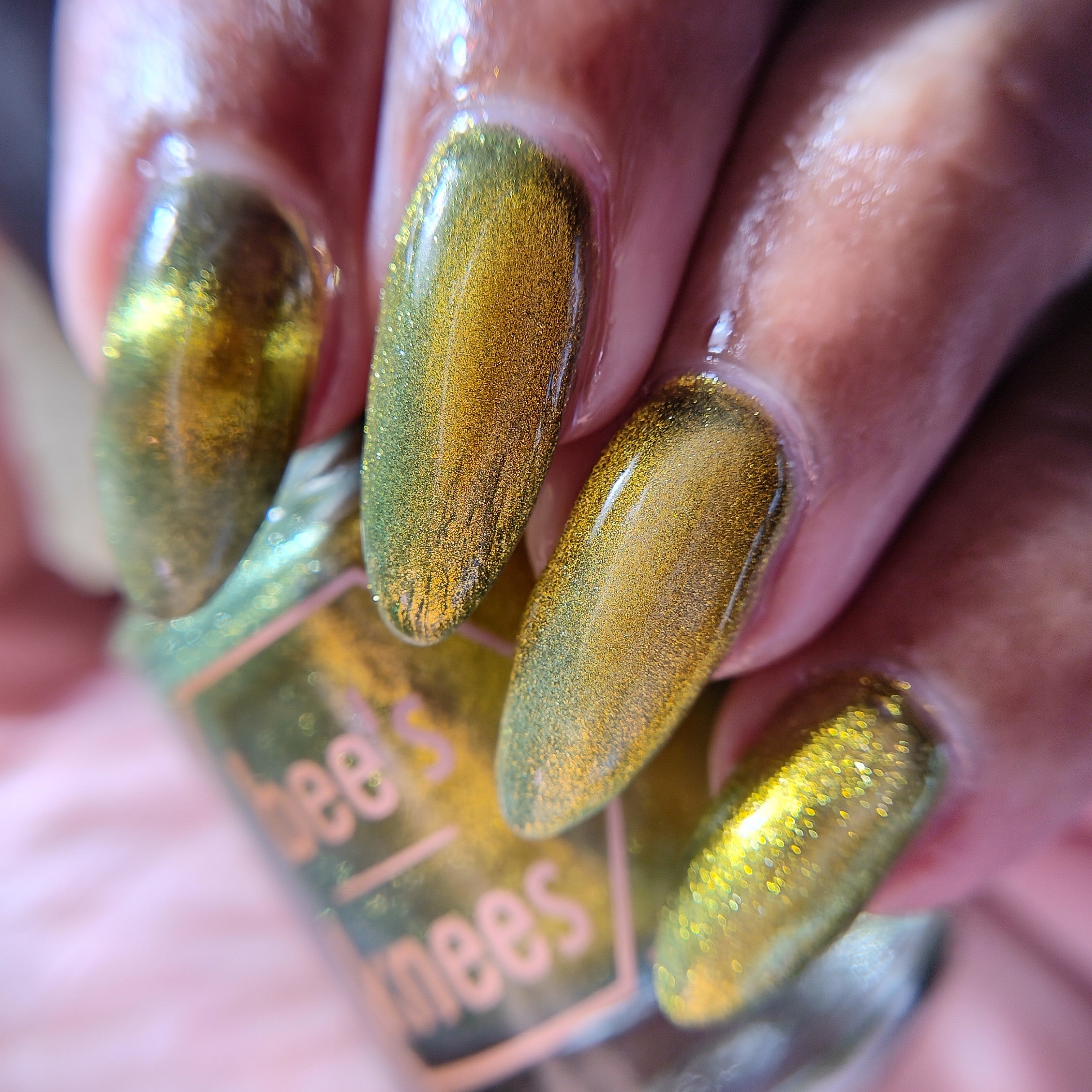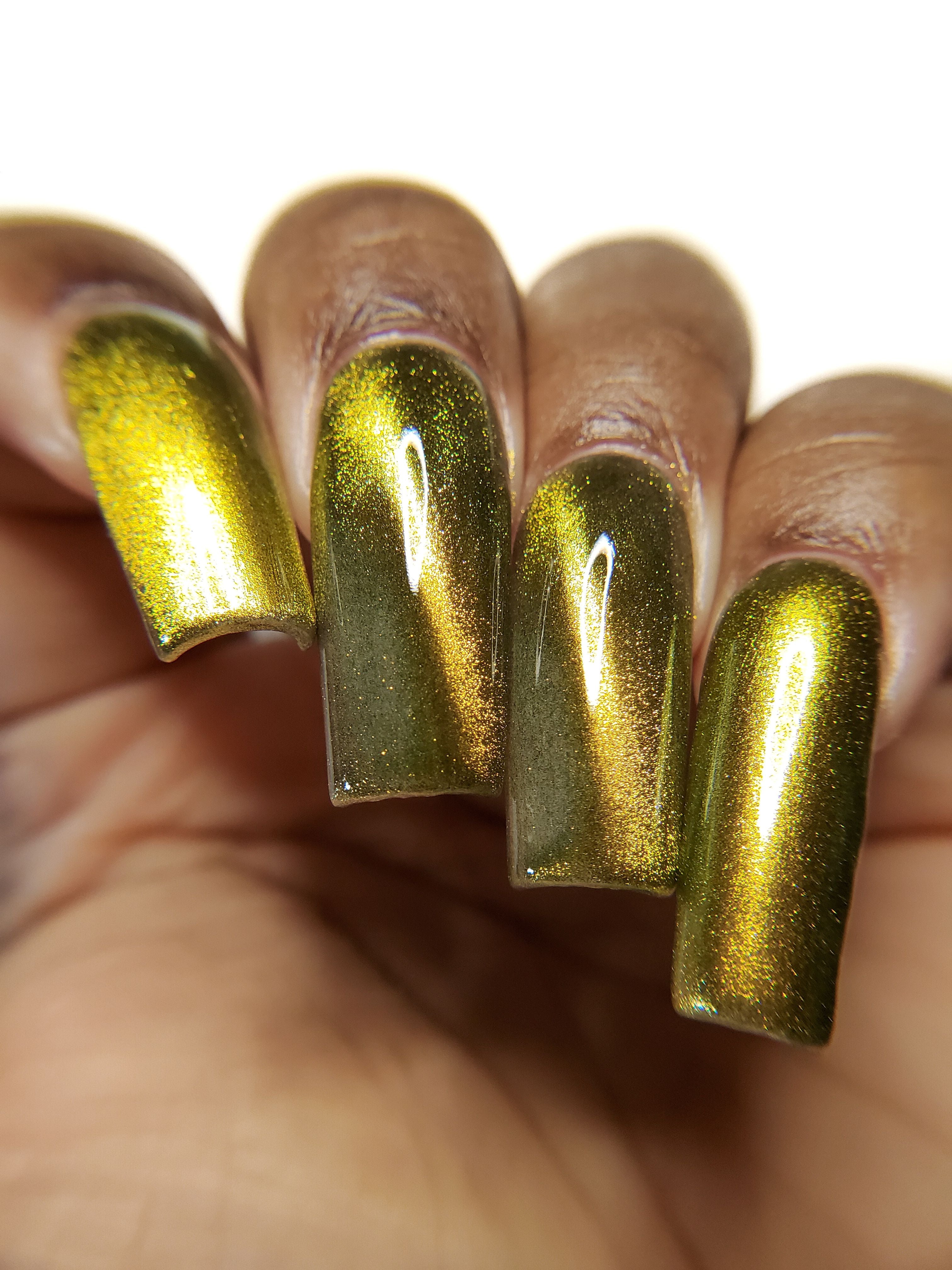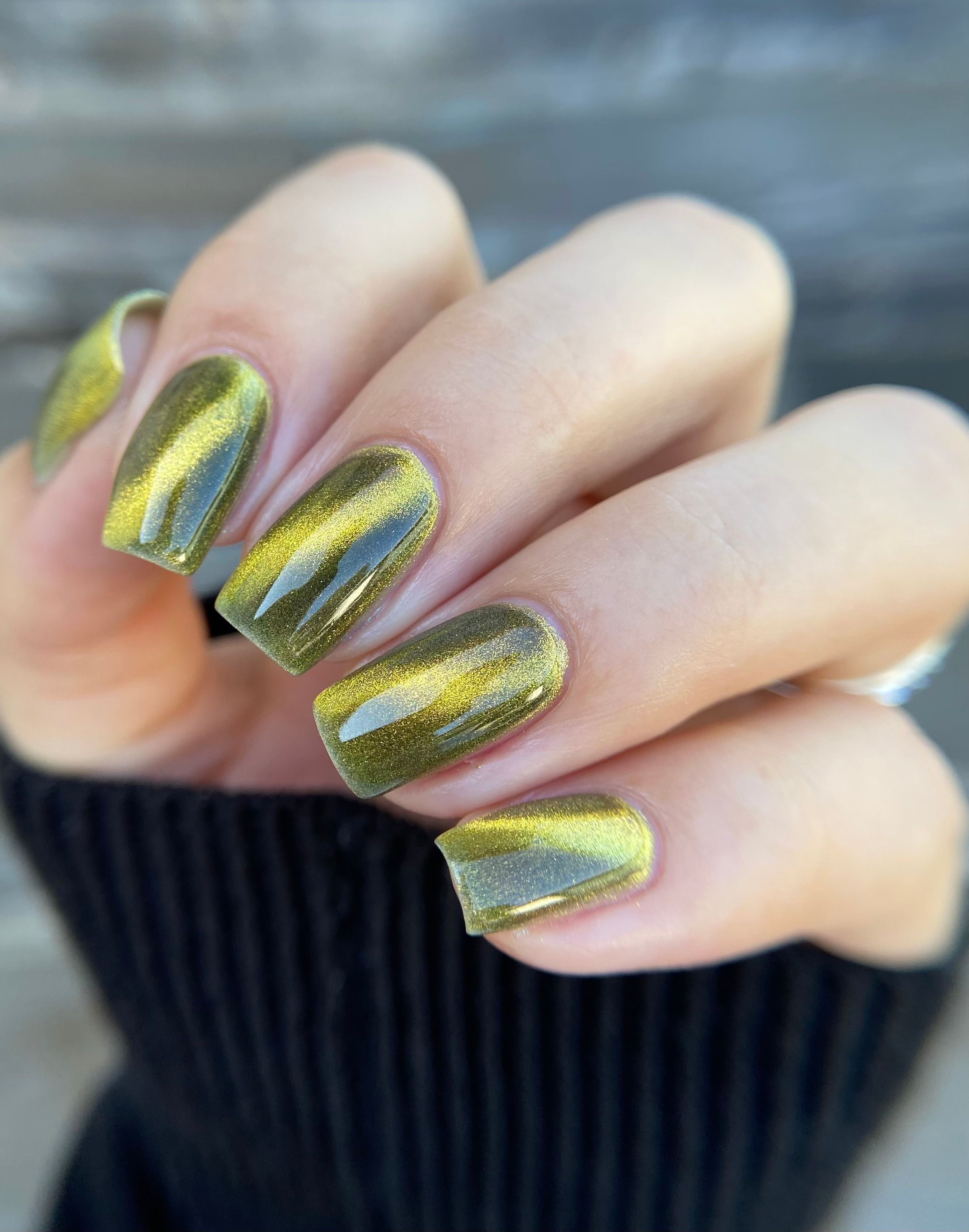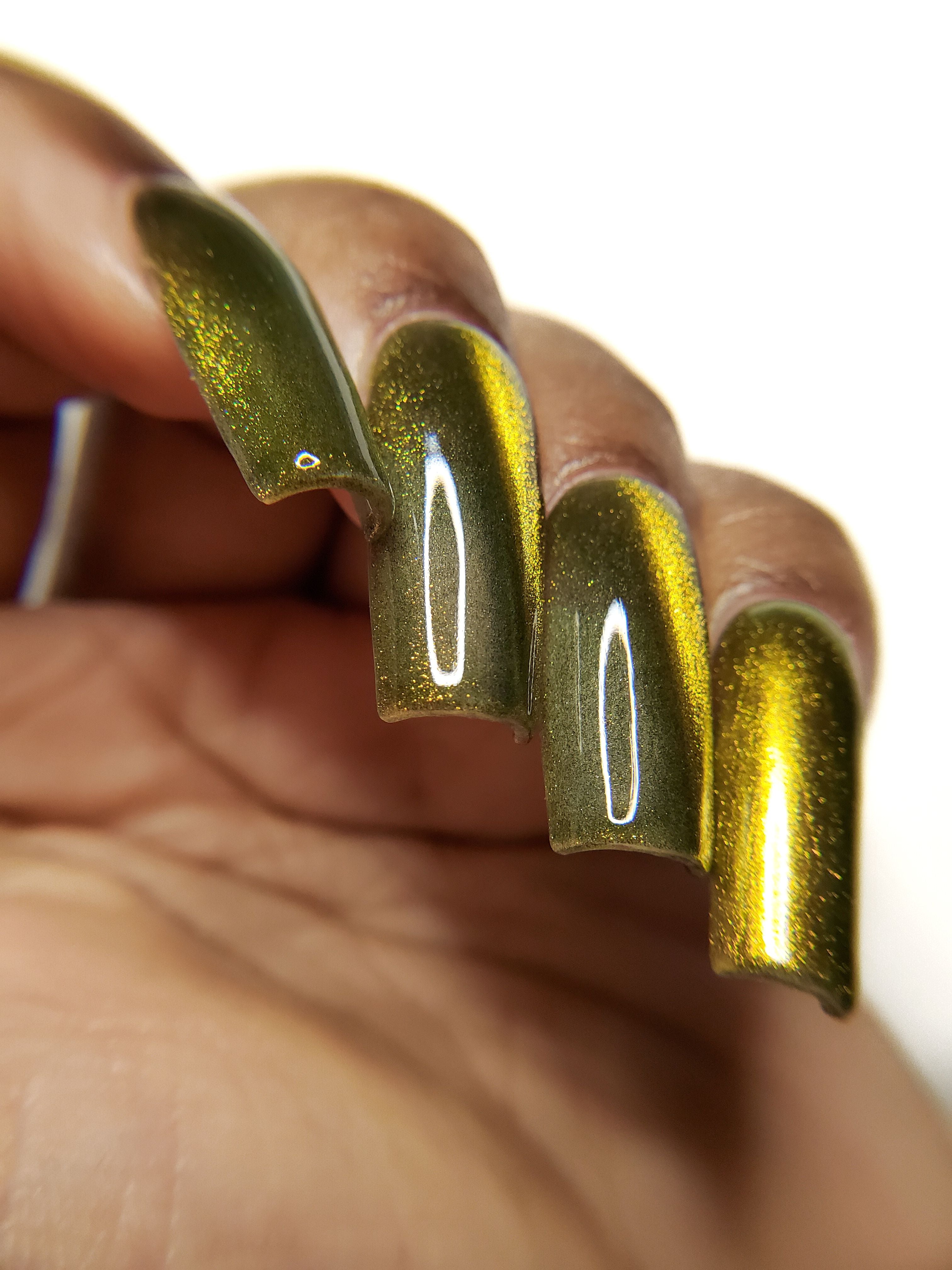 we couldn't be Golden without a gold polish, so this is a grungy green polish with gold magnetic shimmer