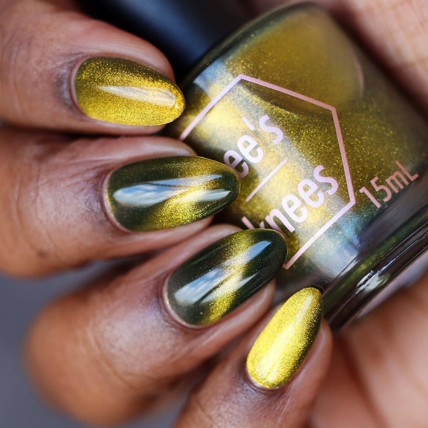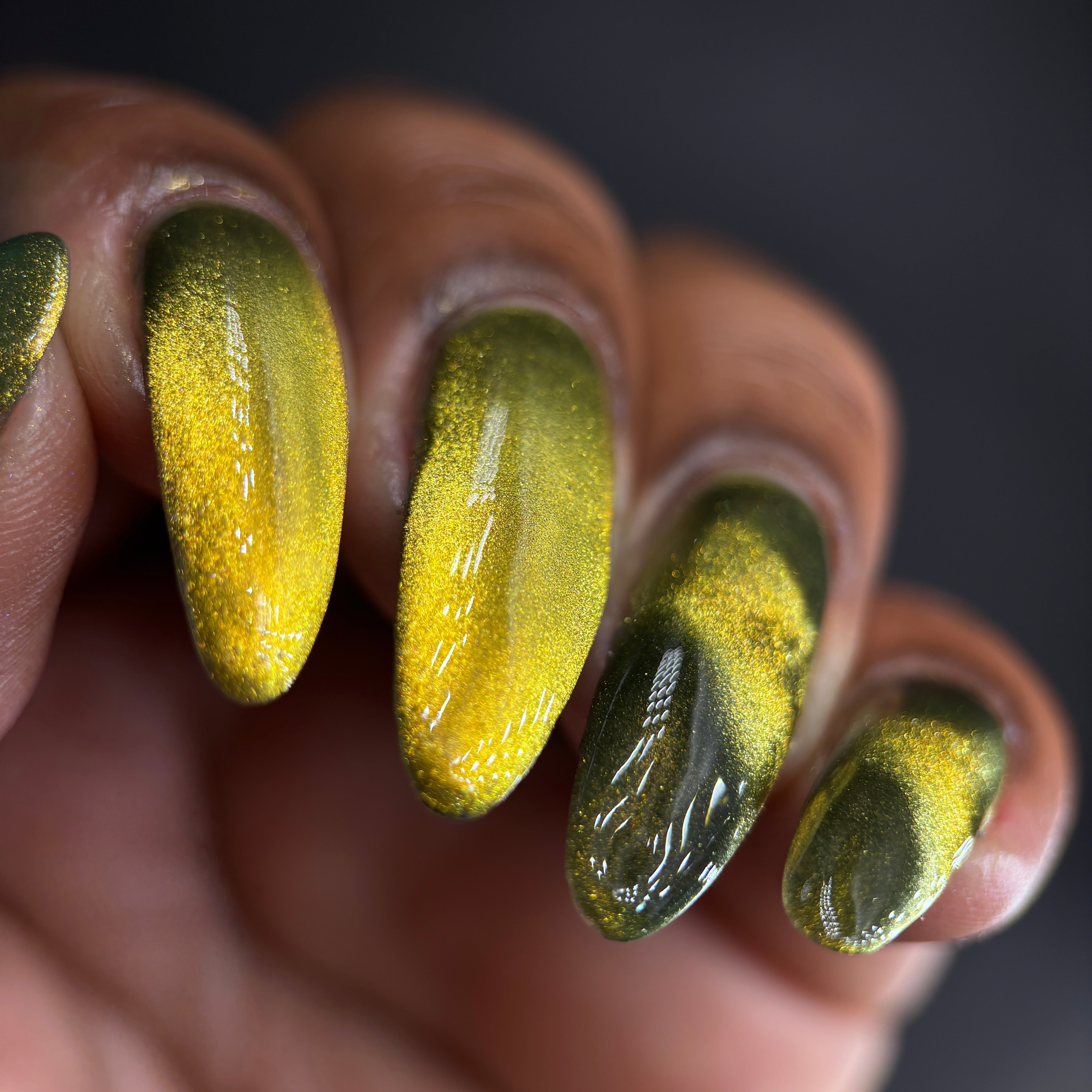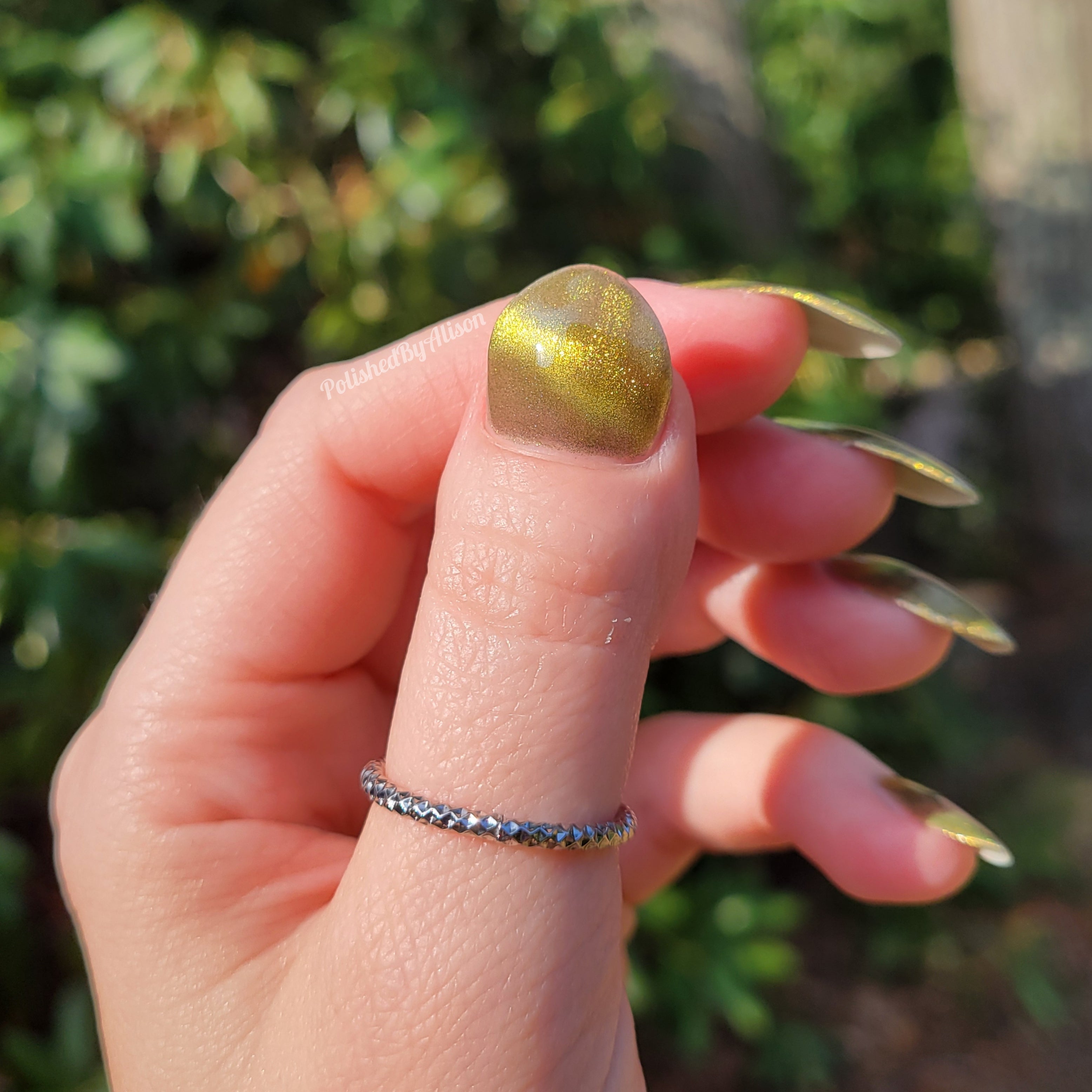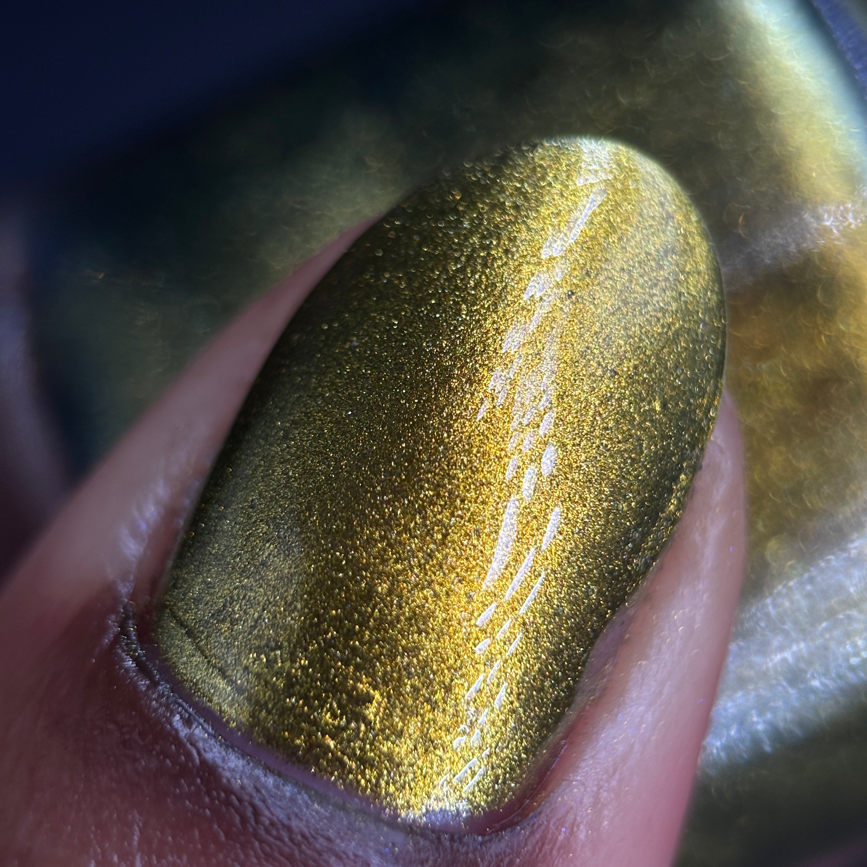 we couldn't be Golden without a gold polish, so this is a grungy green polish with gold magnetic shimmer