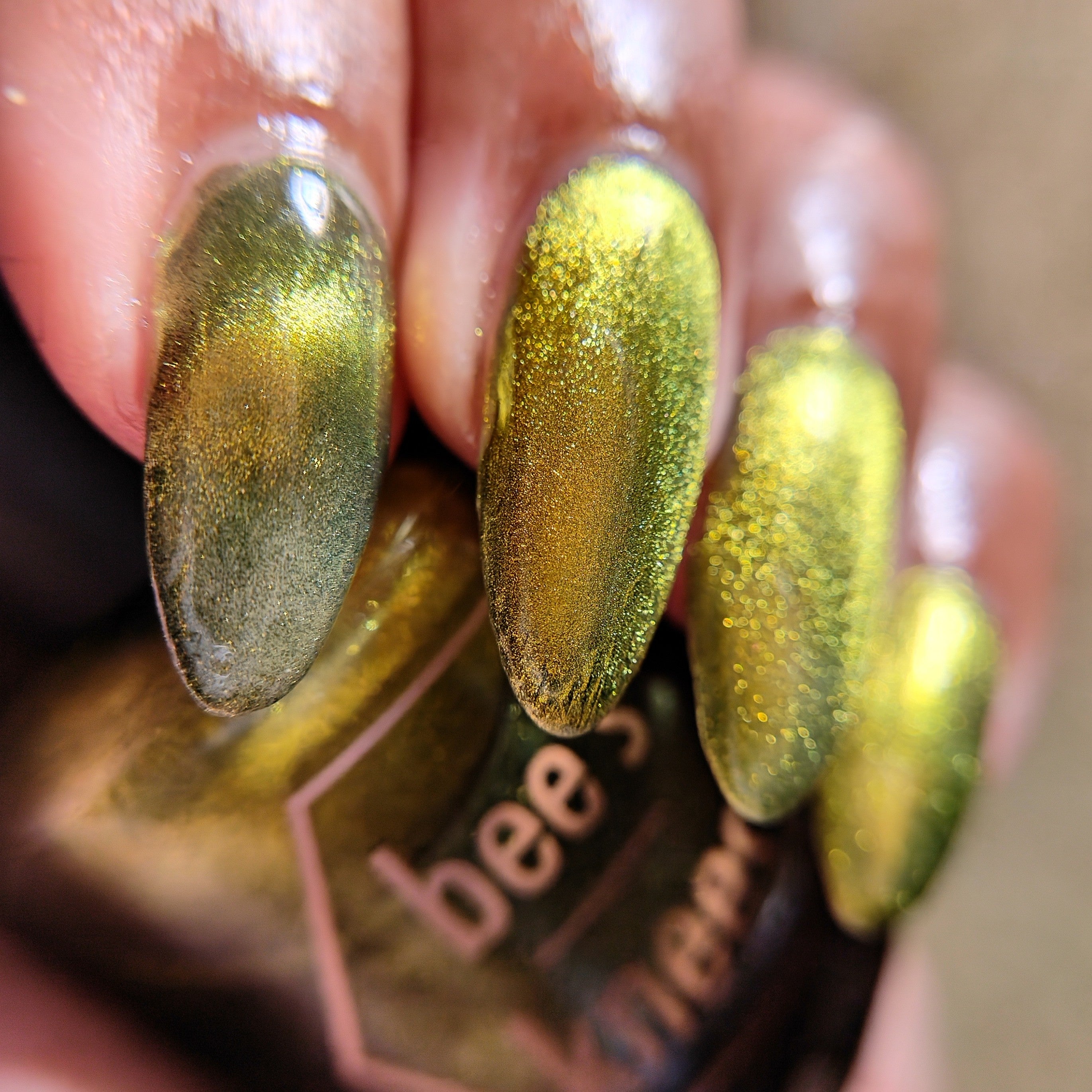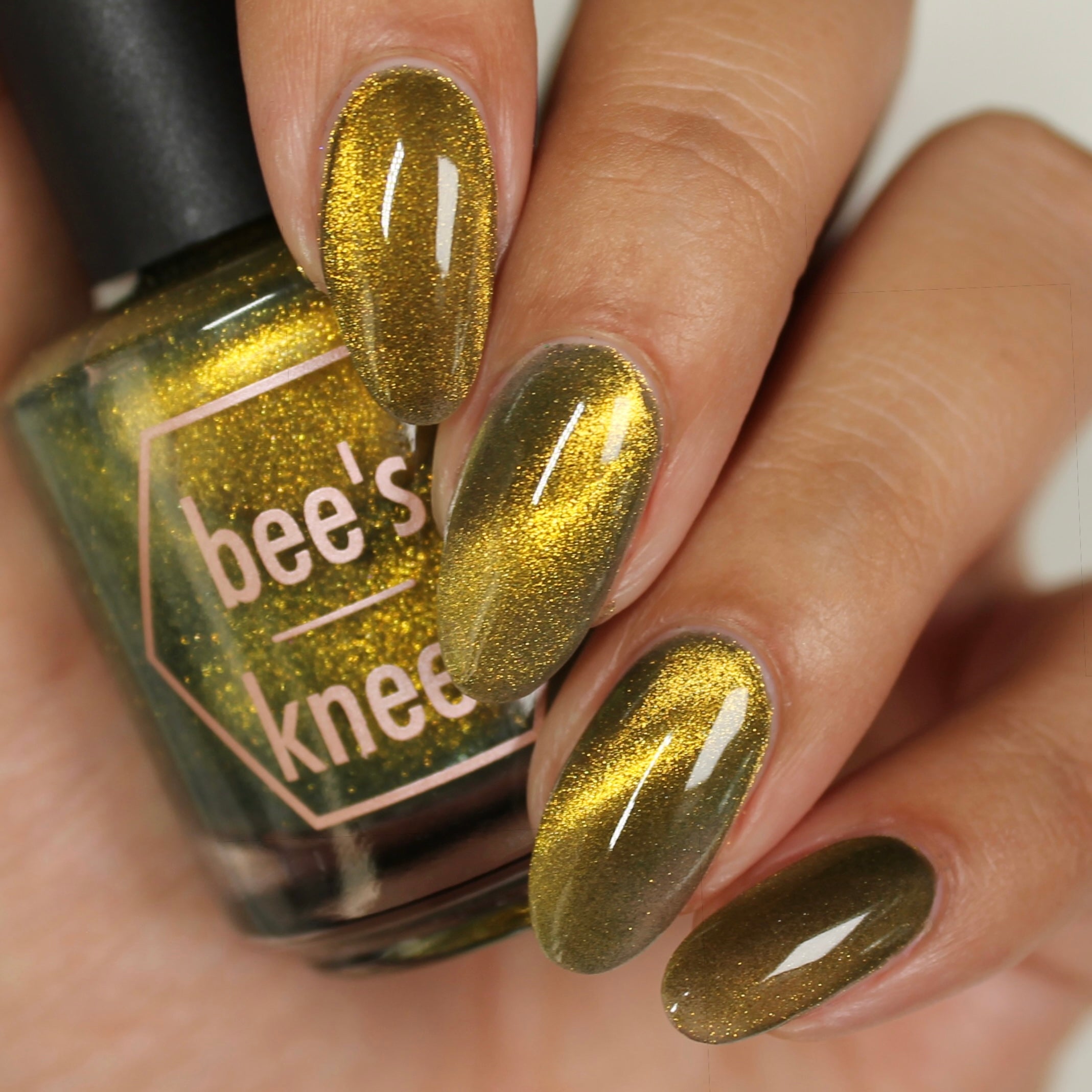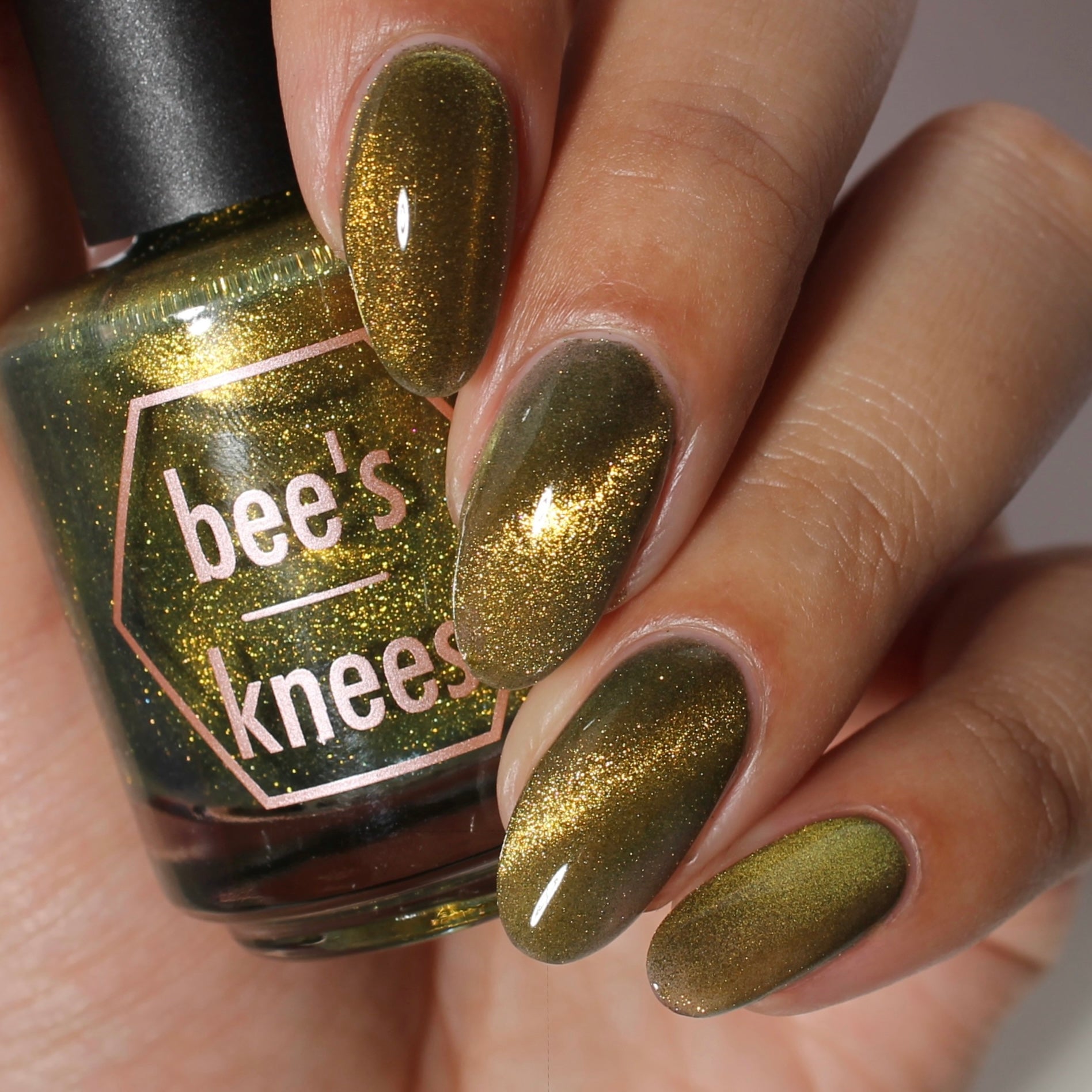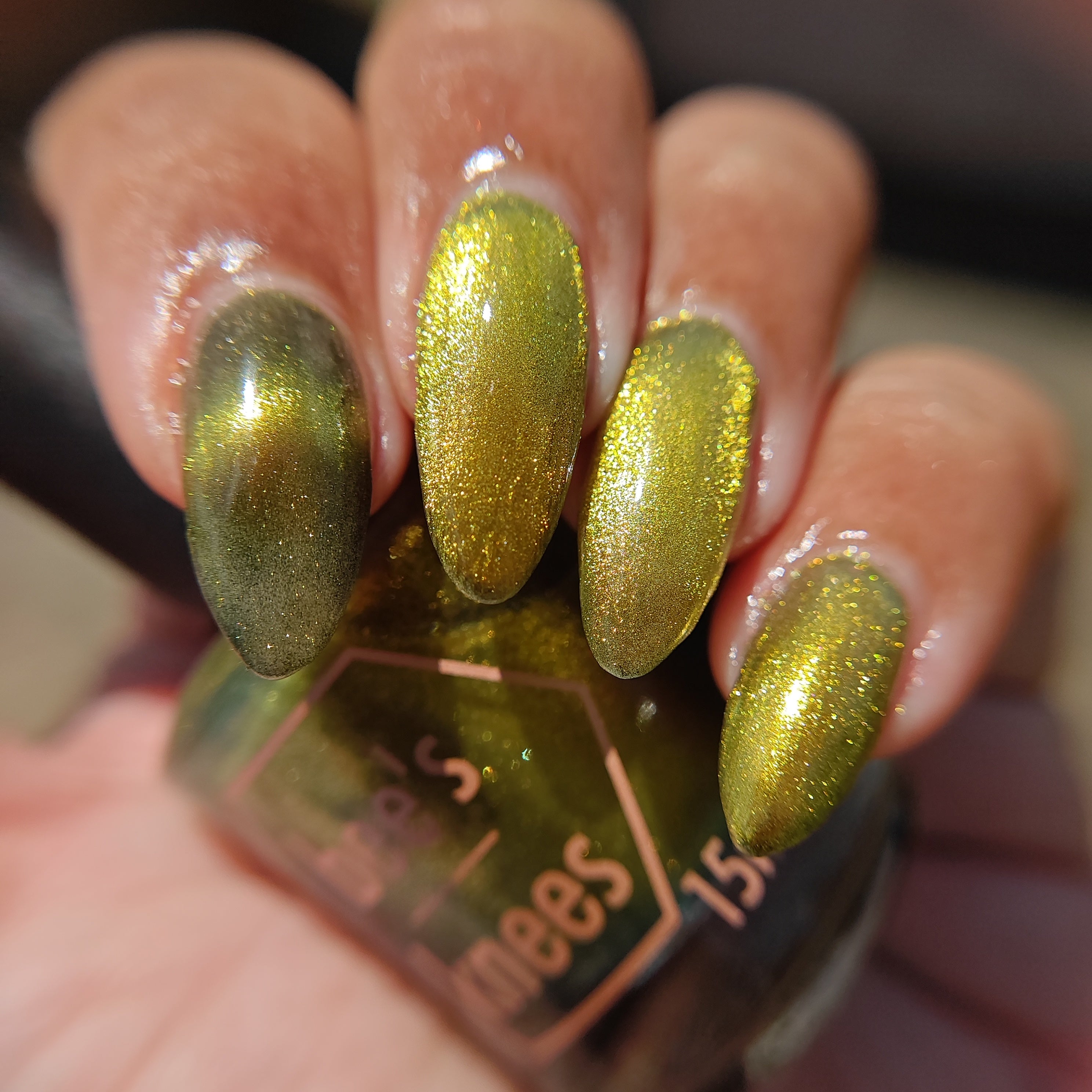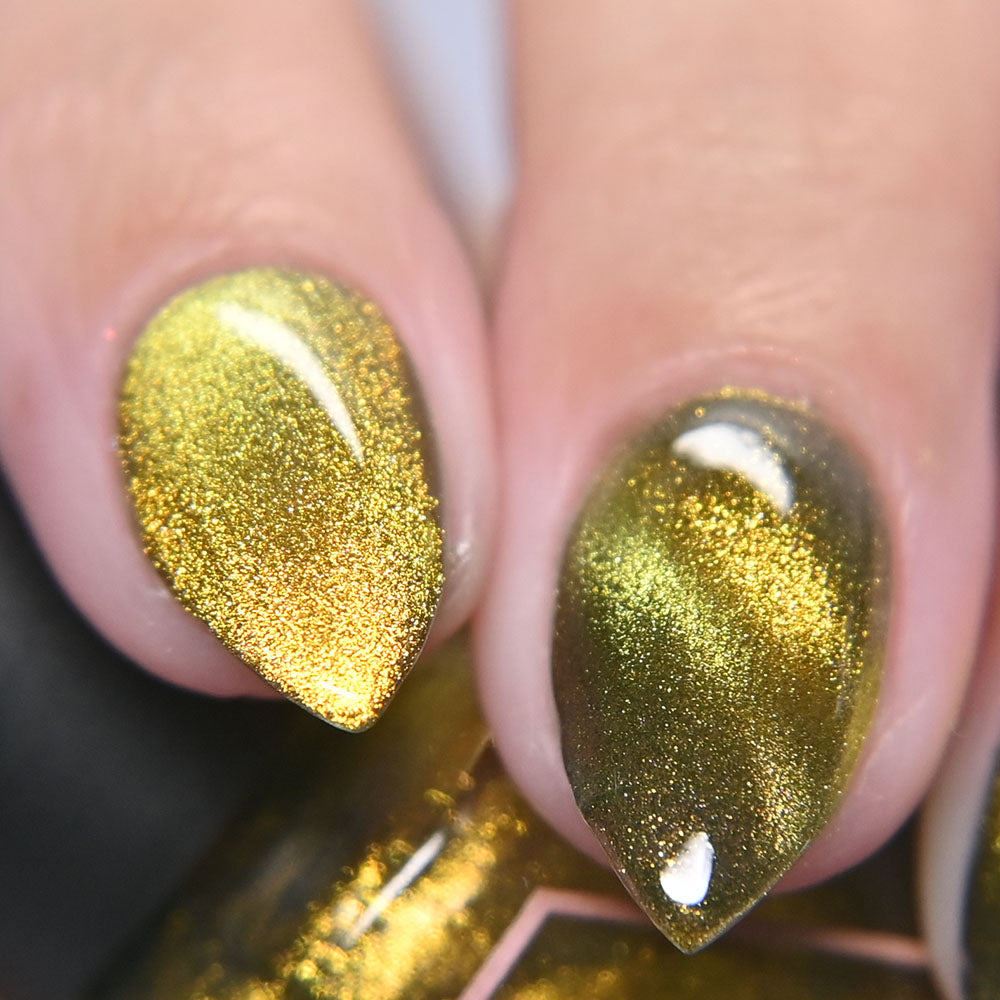 we couldn't be Golden without a gold polish, so this is a grungy green polish with gold magnetic shimmer