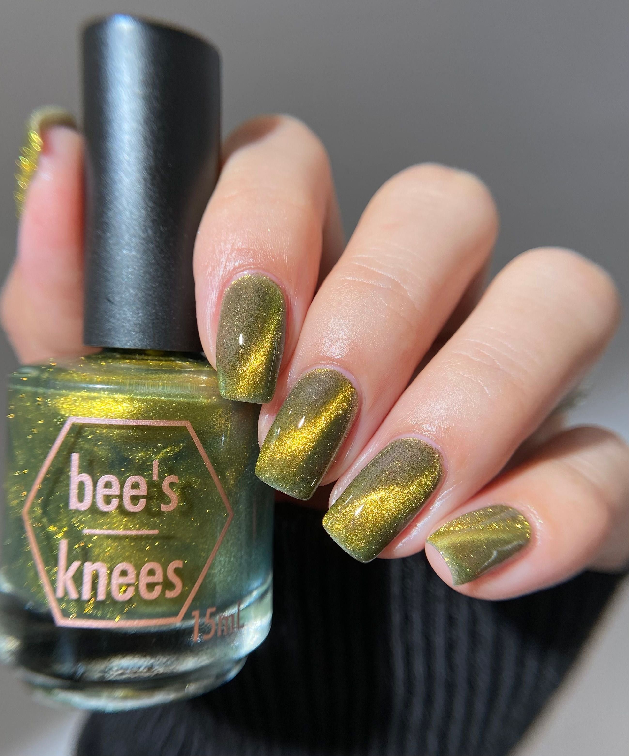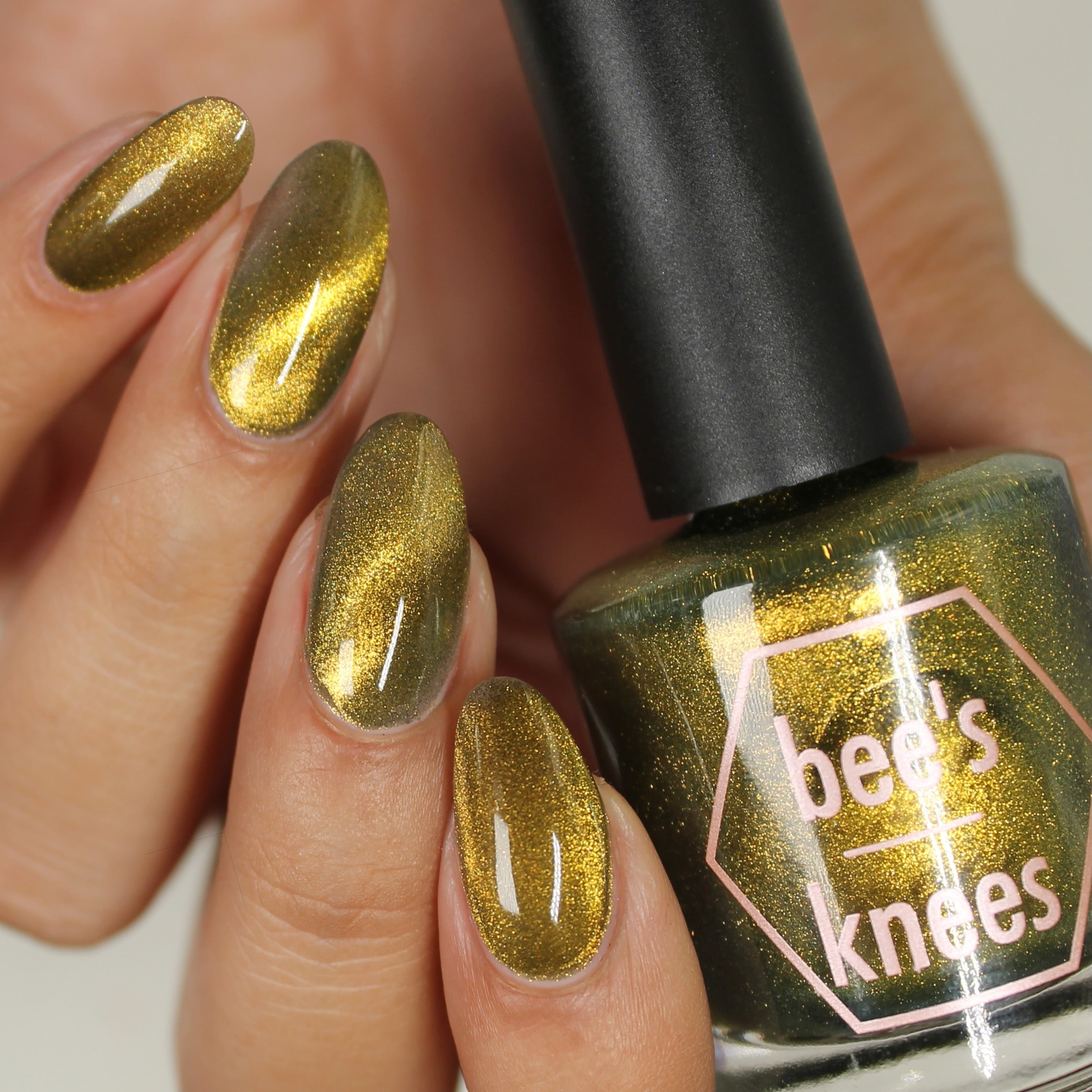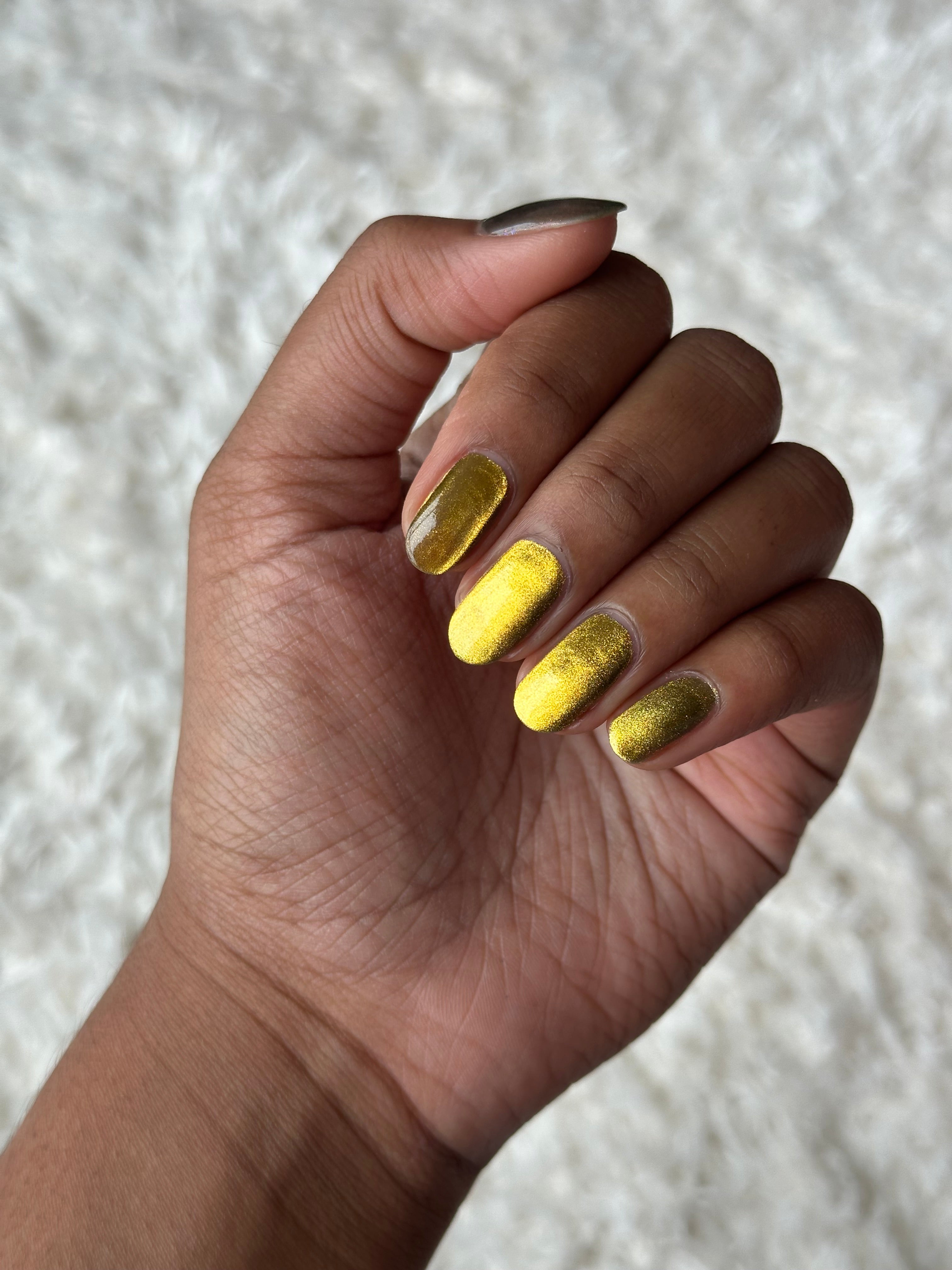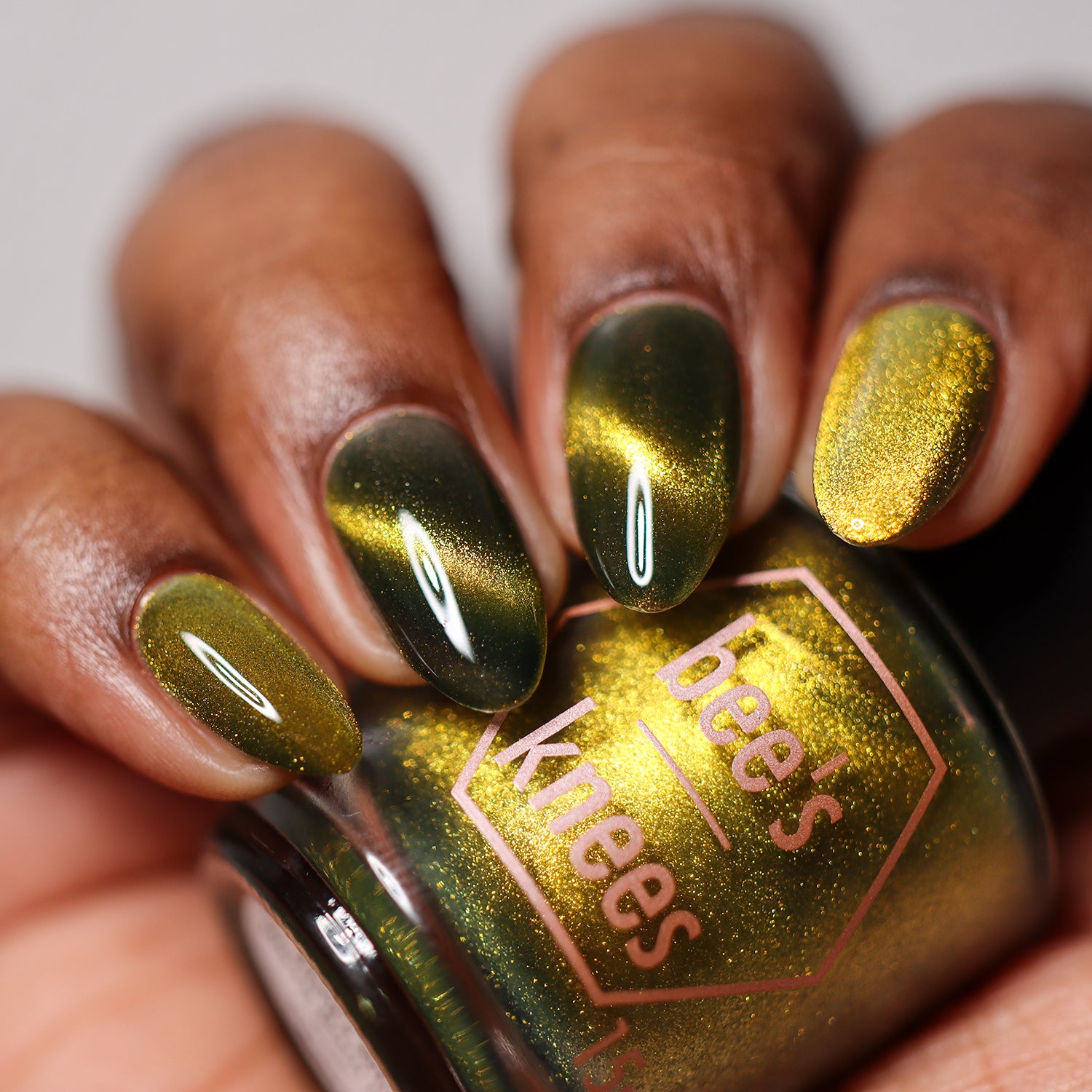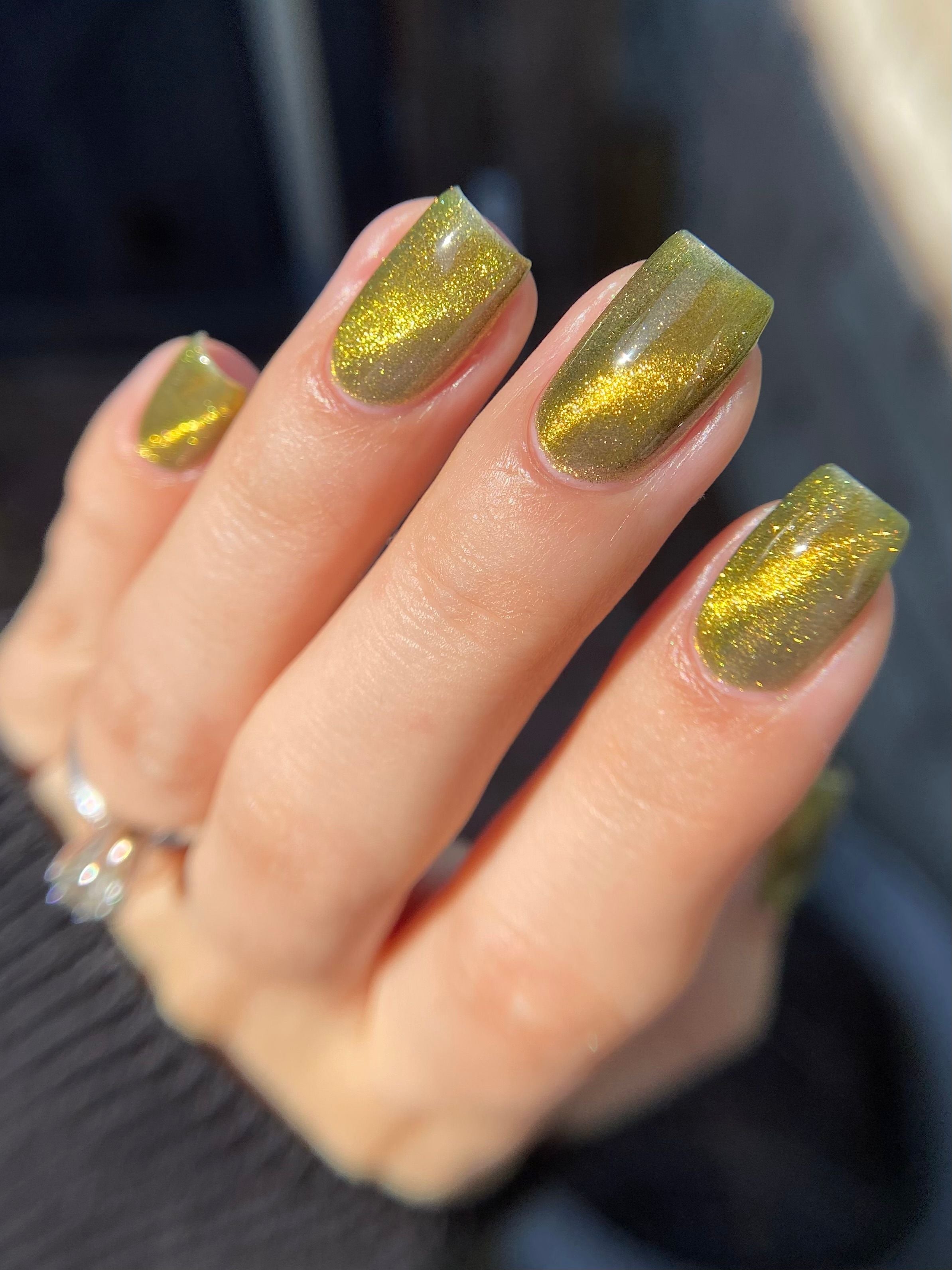 we couldn't be Golden without a gold polish, so this is a grungy green polish with gold magnetic shimmer