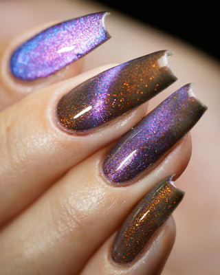 a mosaic magnetic that upon first glance looks like an ordinary purple multichrome. When magnetized you will see both a rich purple and a deep blue magnetic pigment with the addition of OG red to green UP