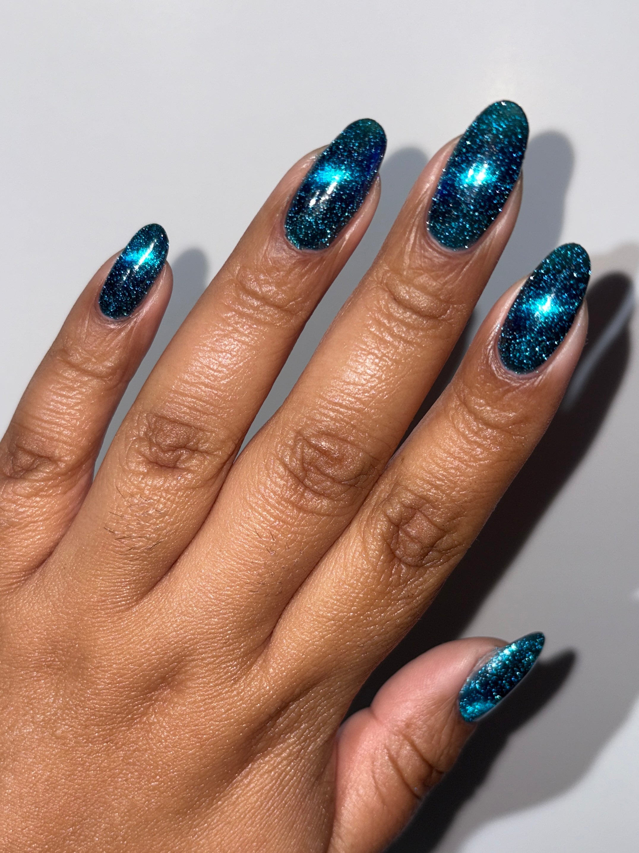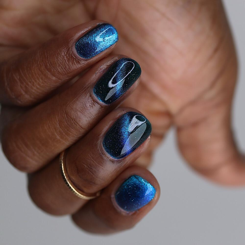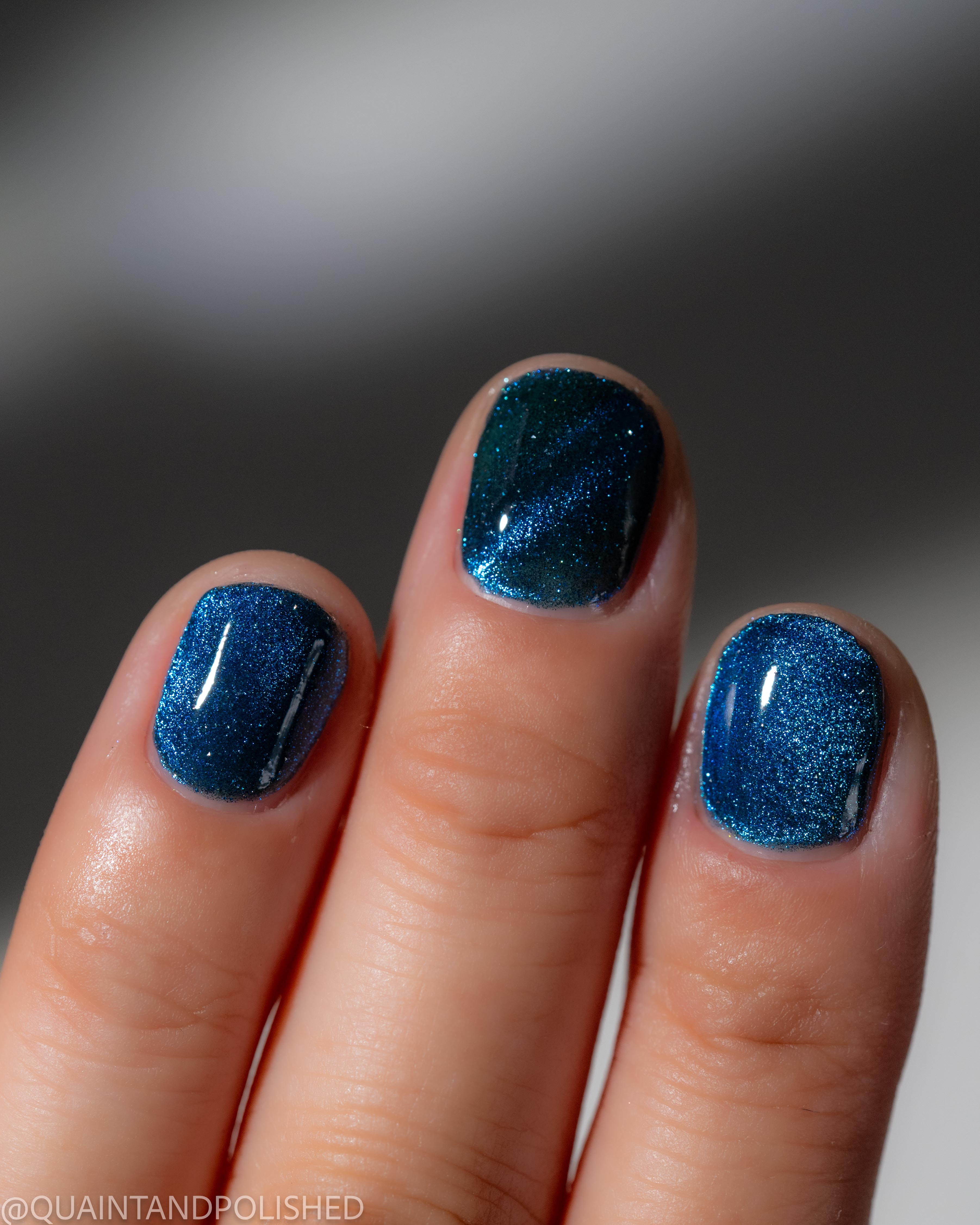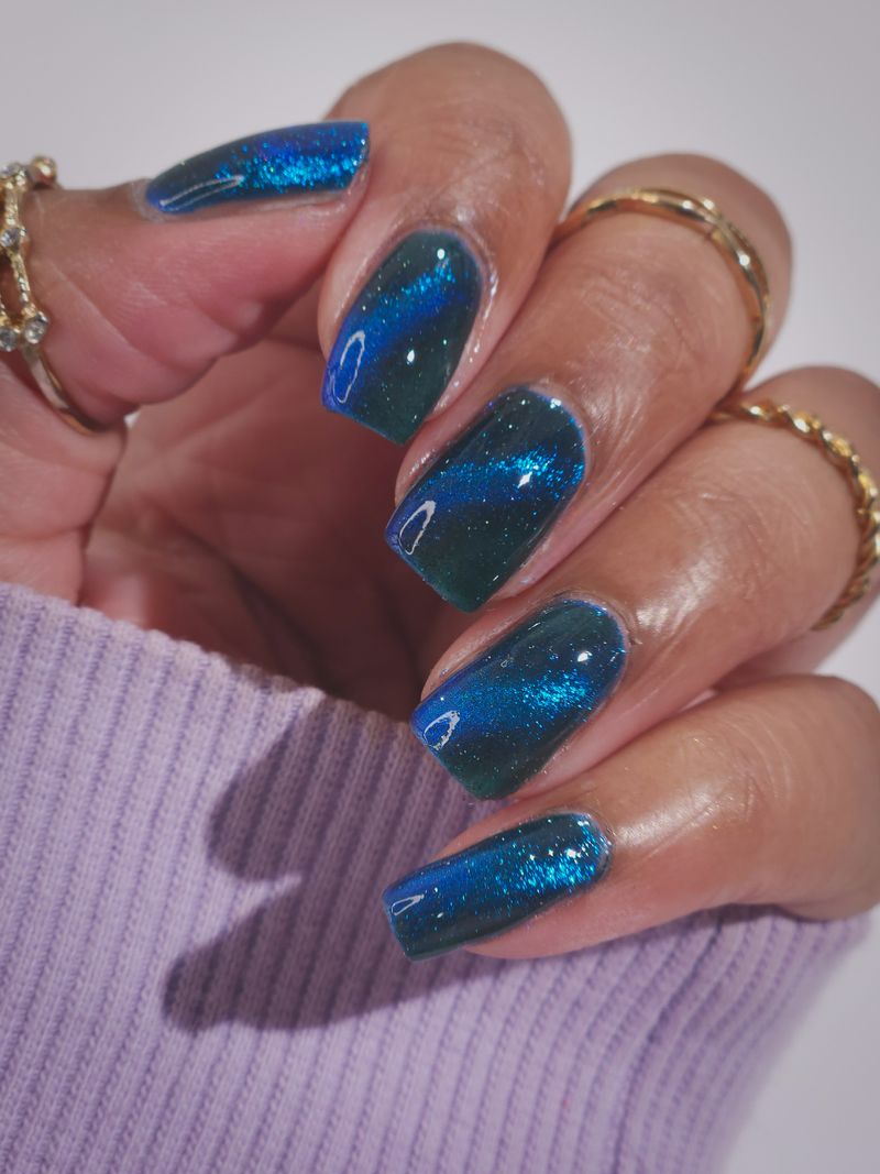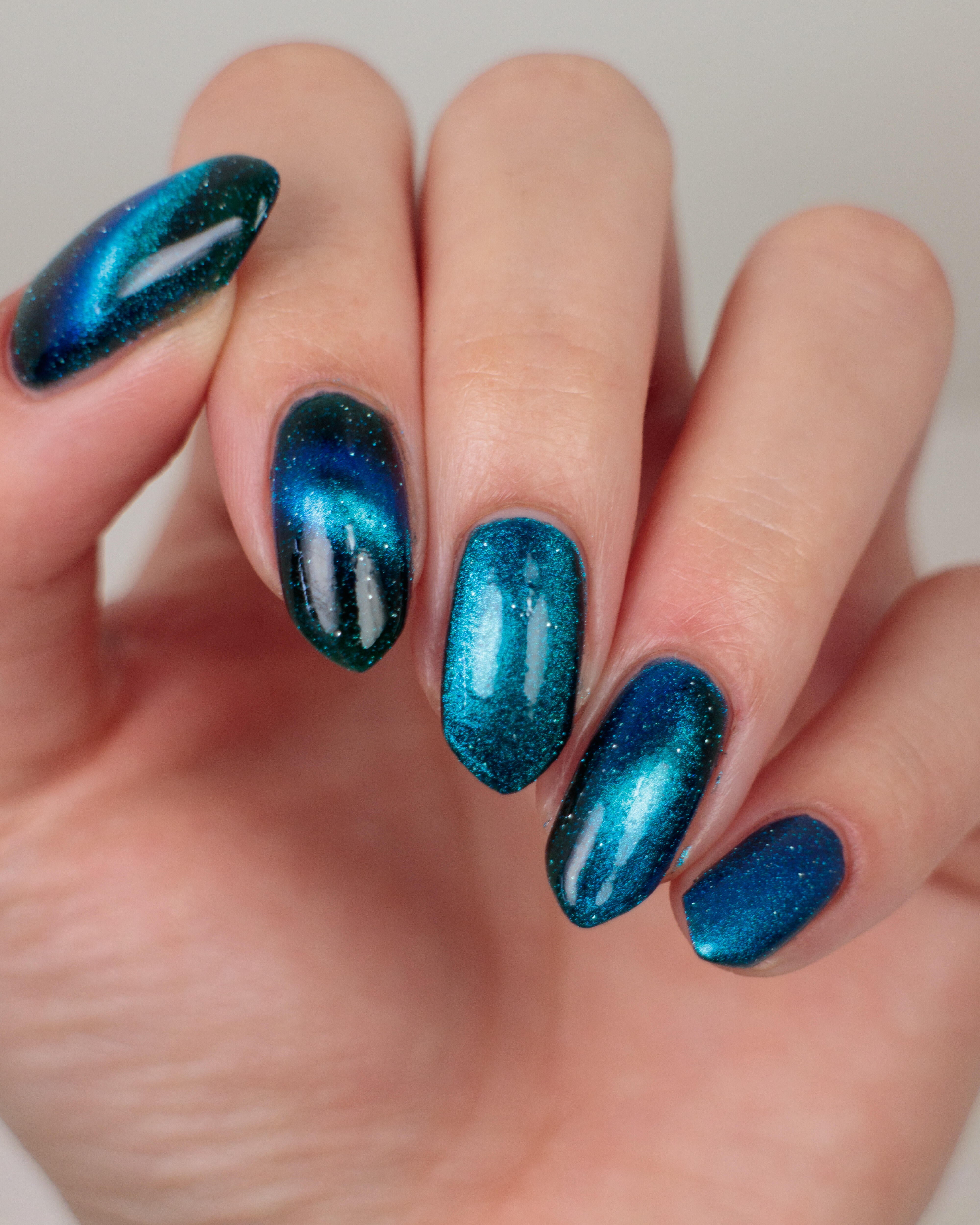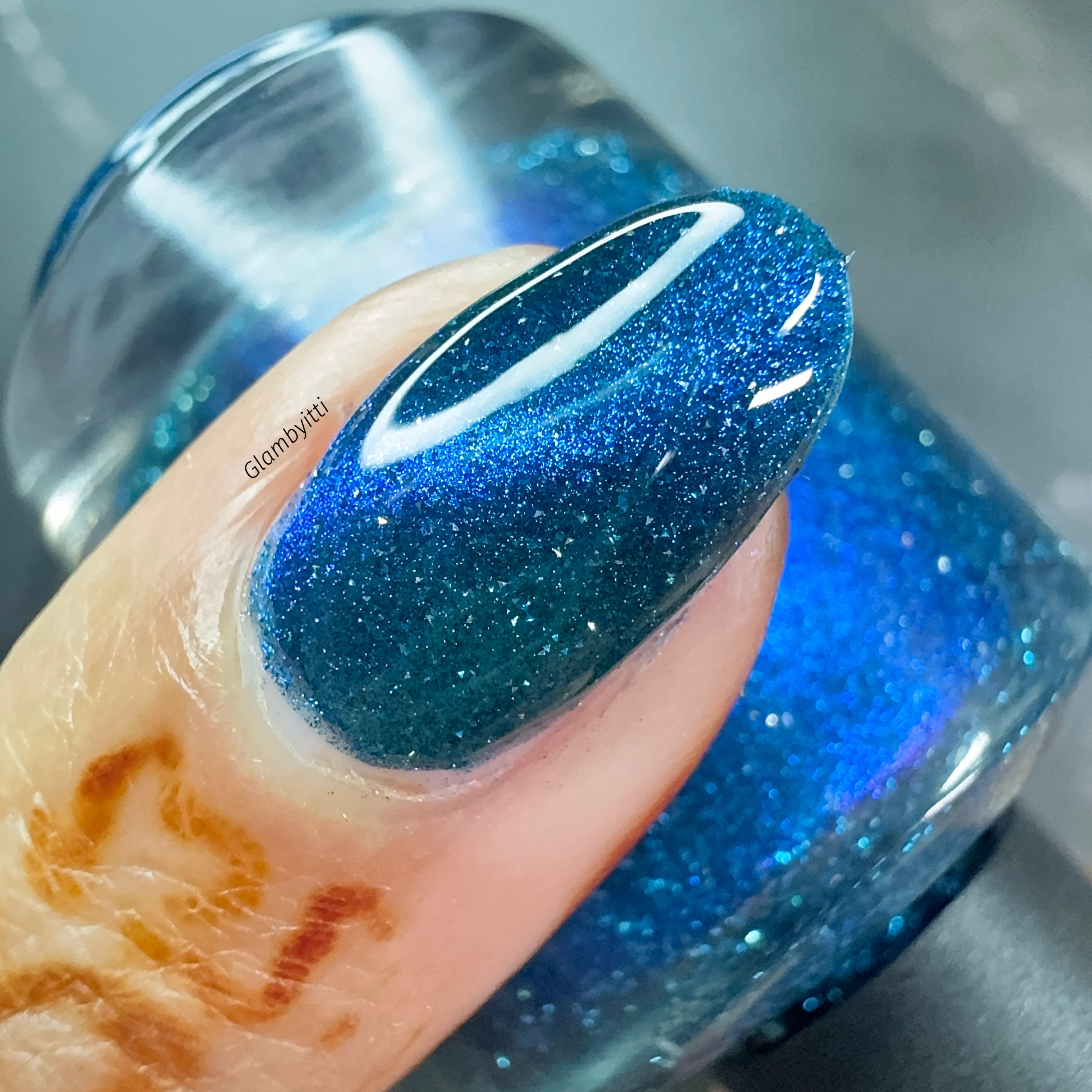 a dark turquoise with glowing blue magnetic shimmer and blue light reflective glitter