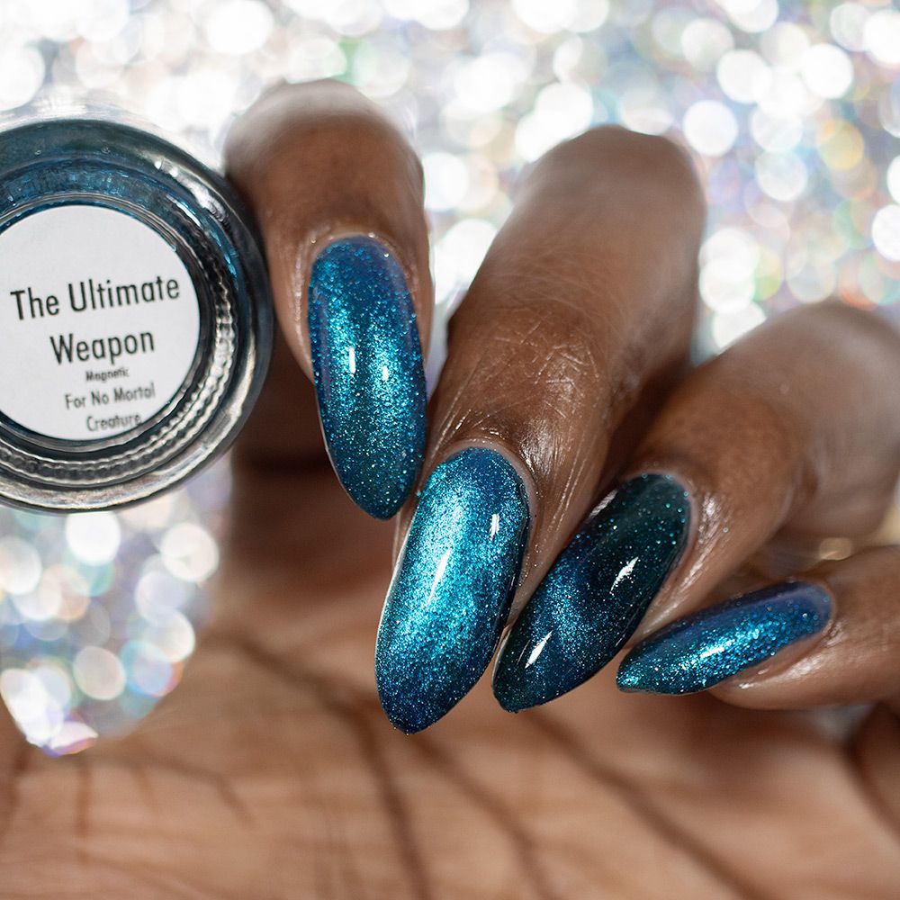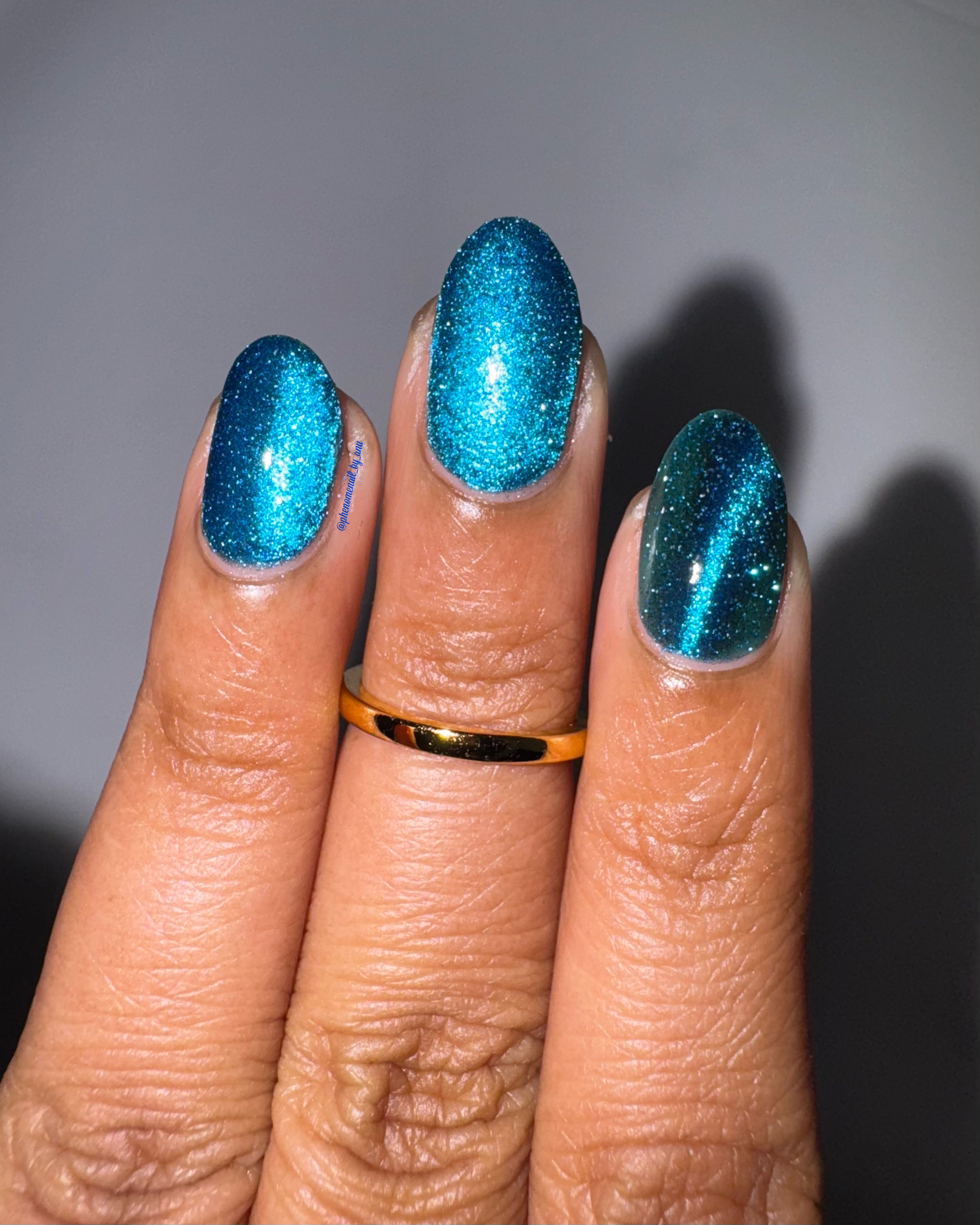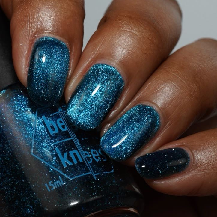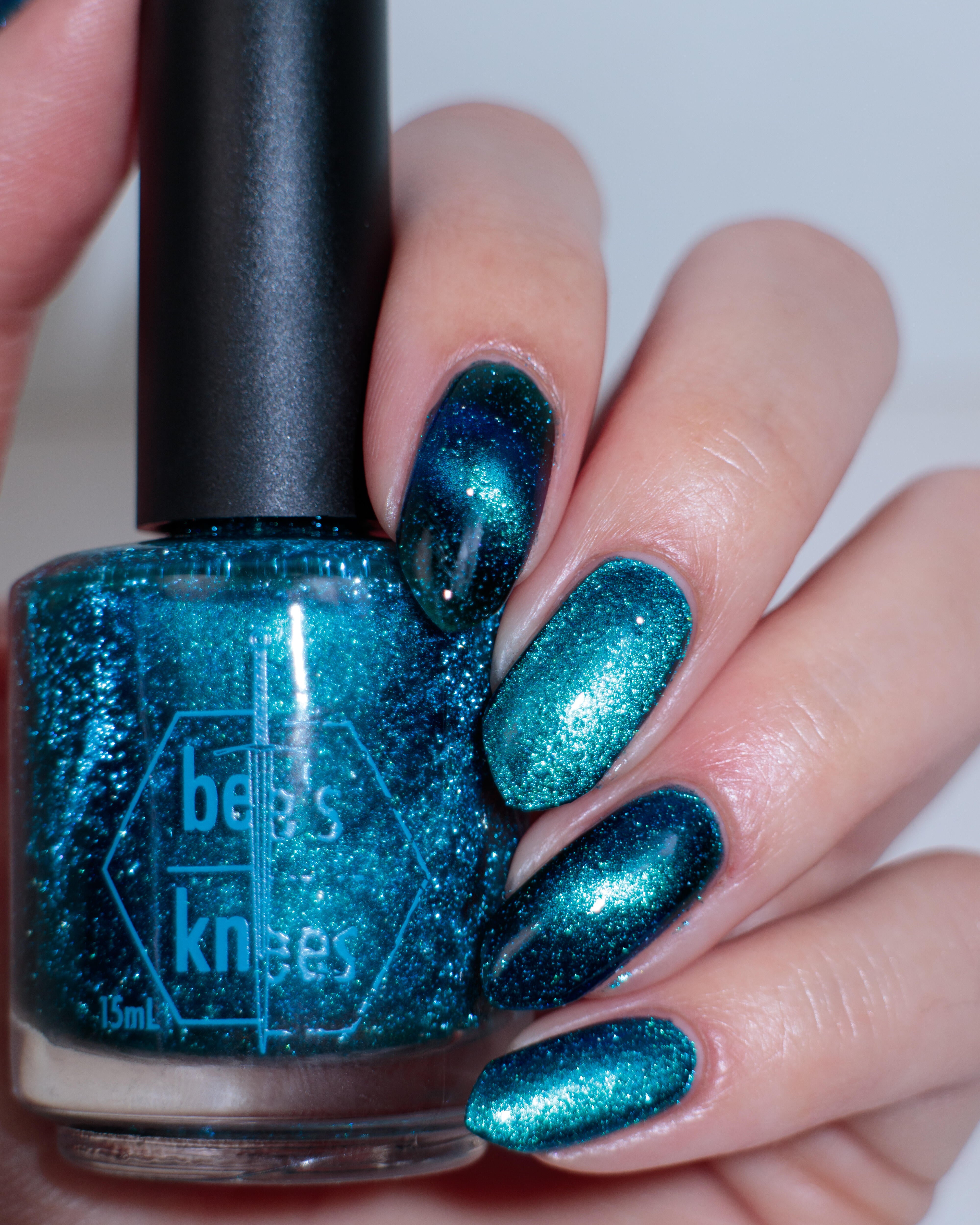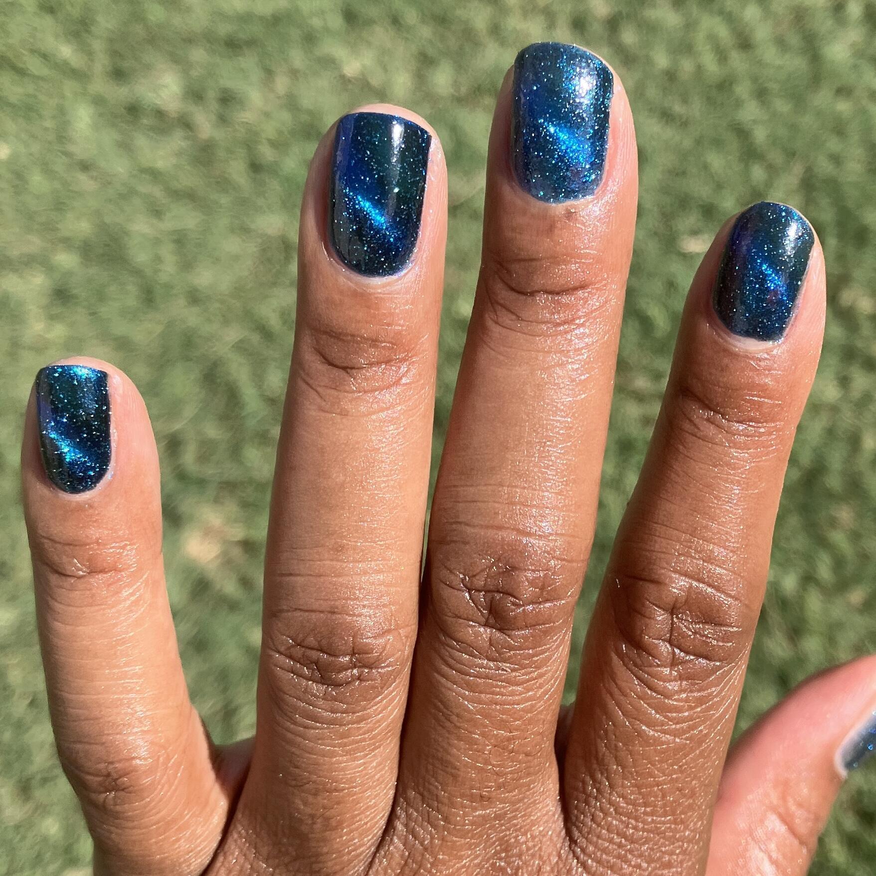 a dark turquoise with glowing blue magnetic shimmer and blue light reflective glitter