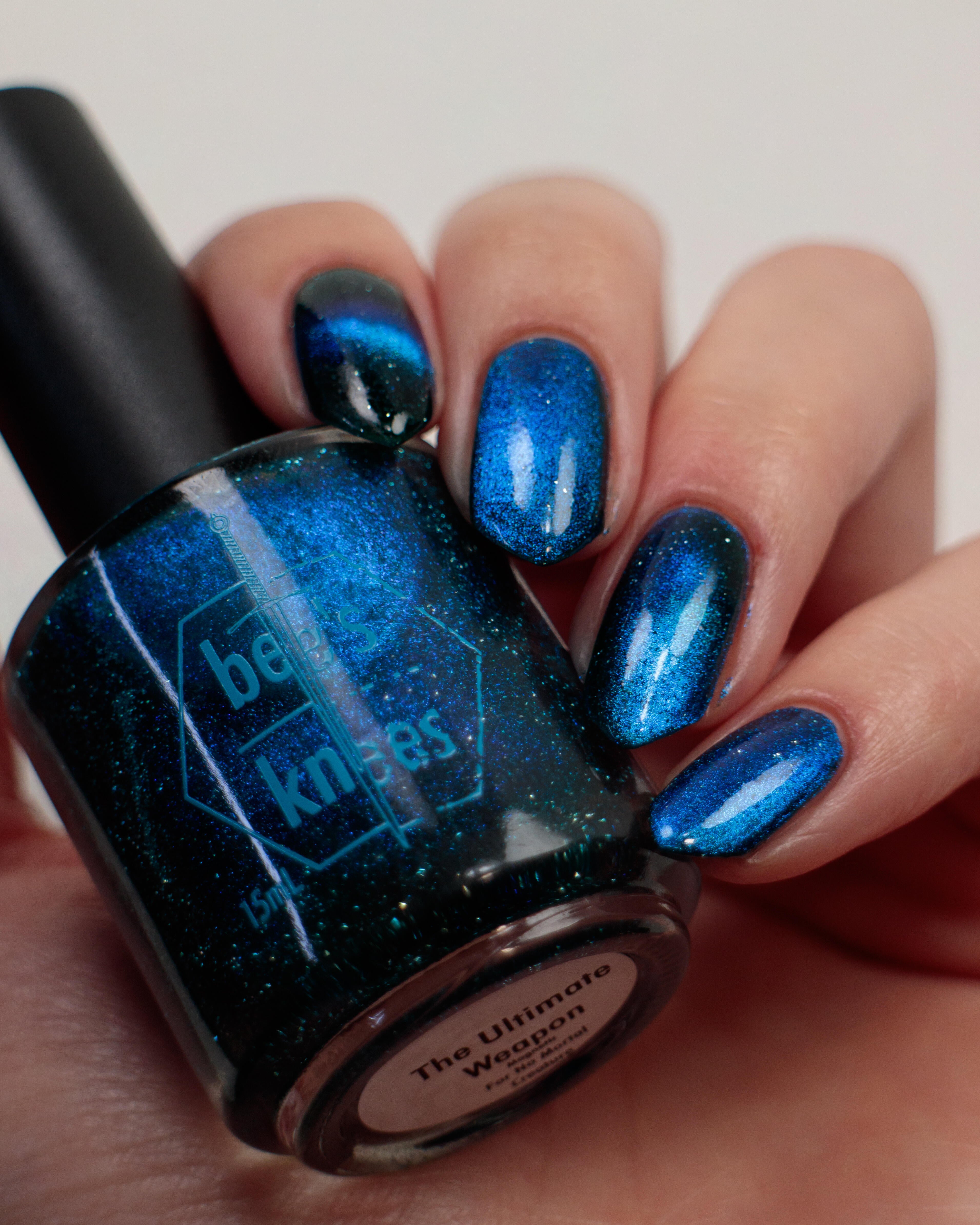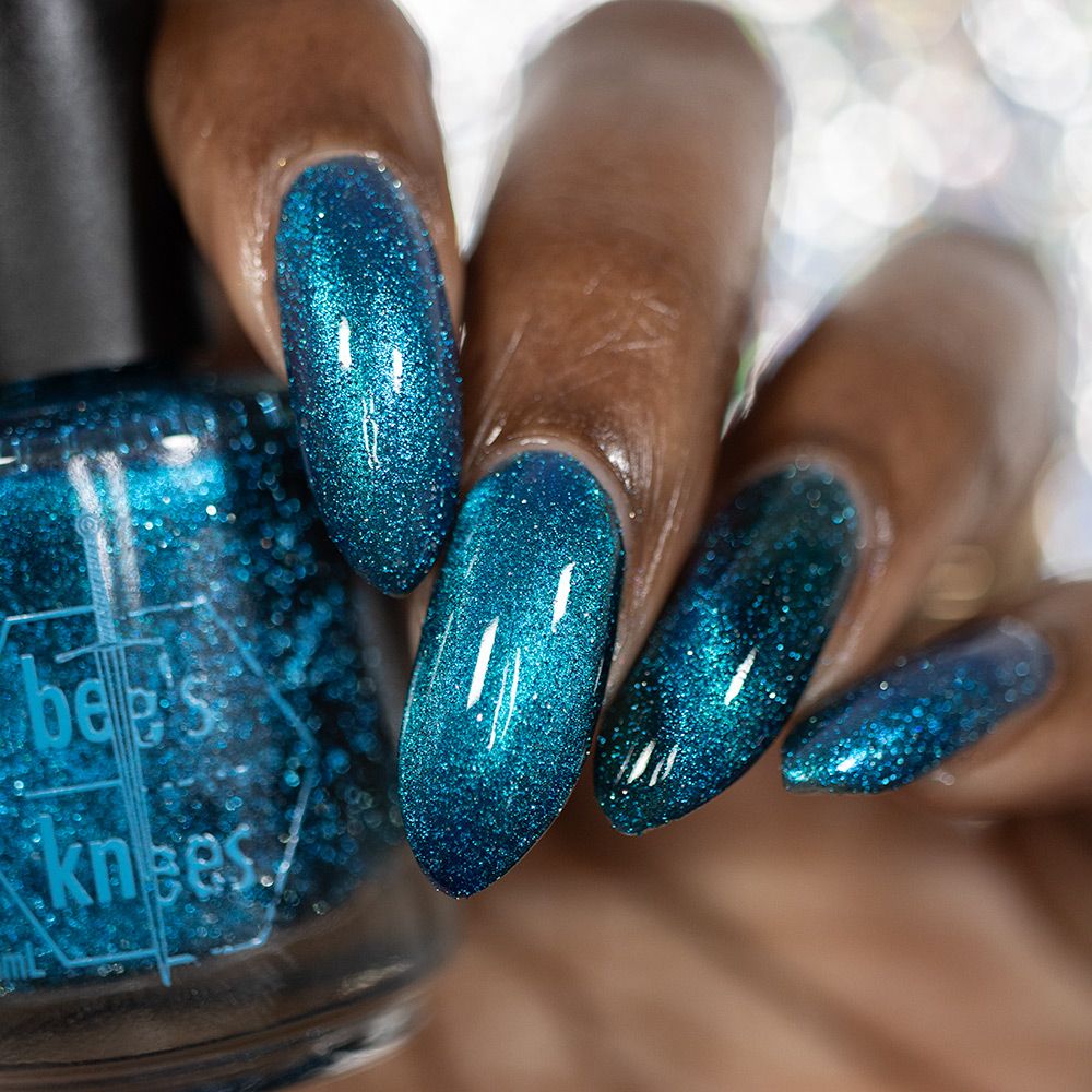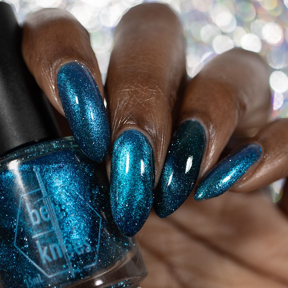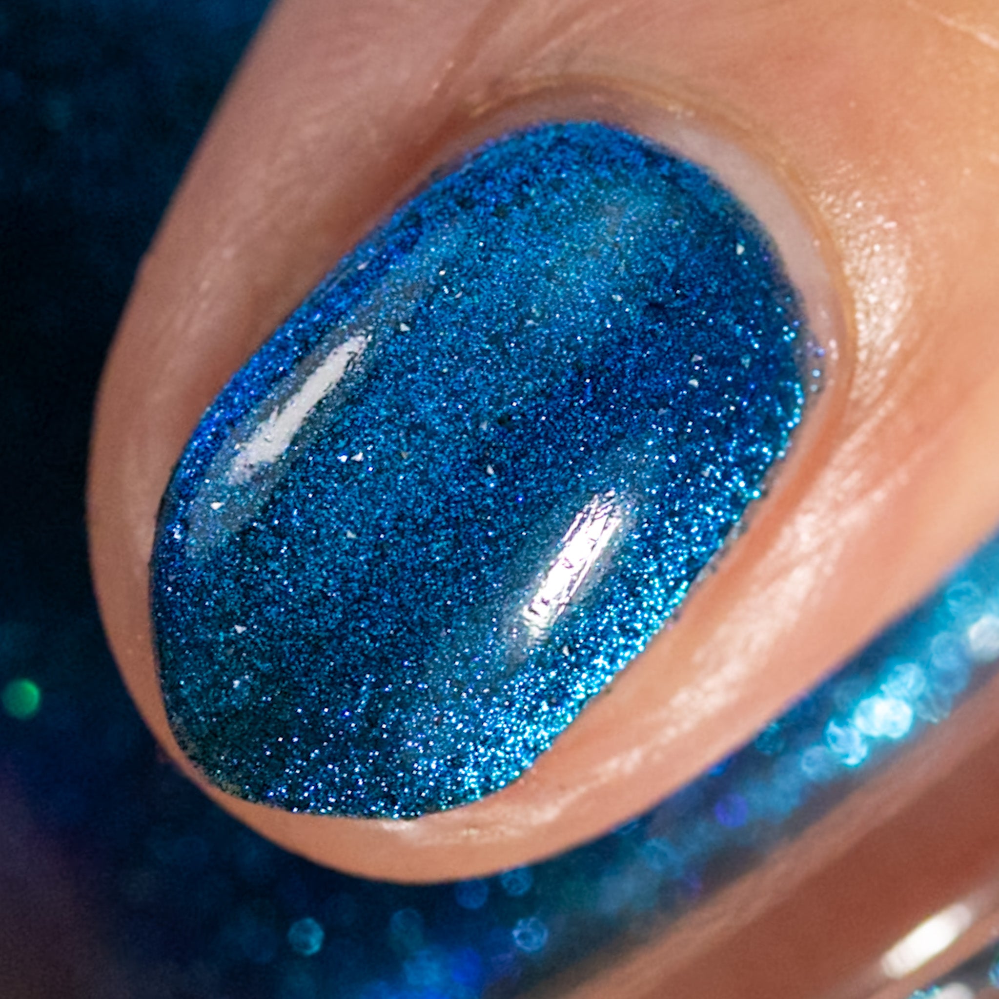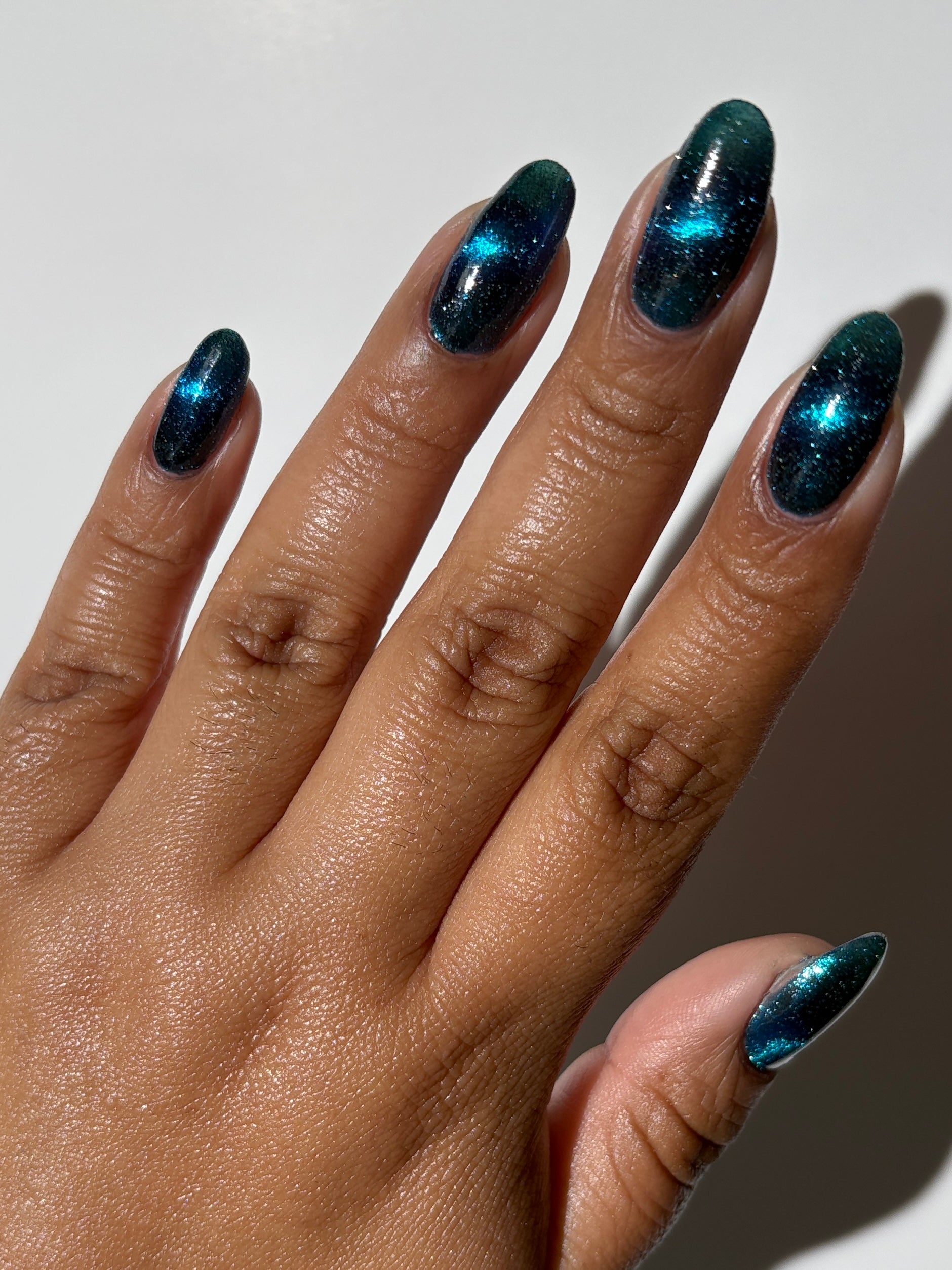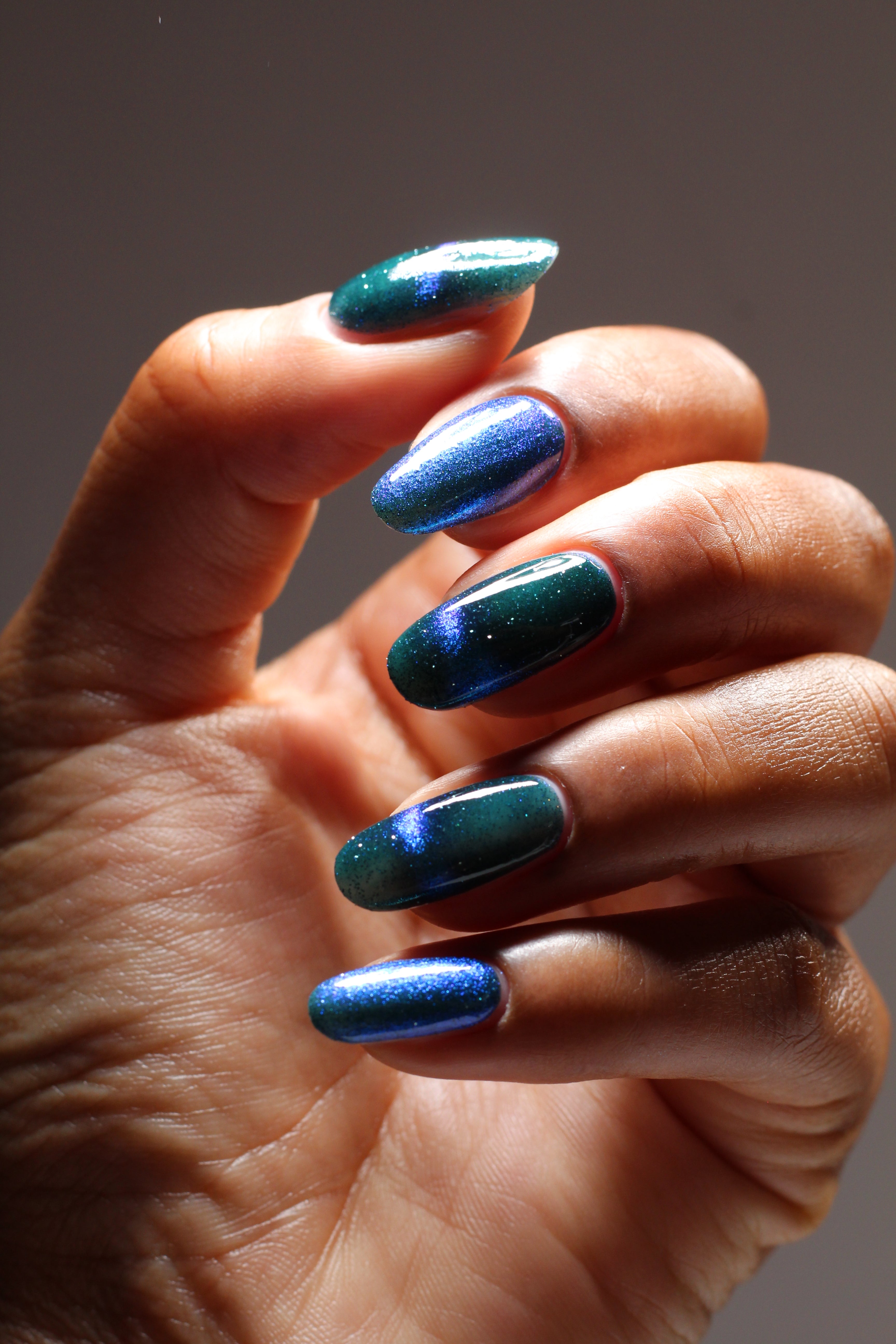 a dark turquoise with glowing blue magnetic shimmer and blue light reflective glitter