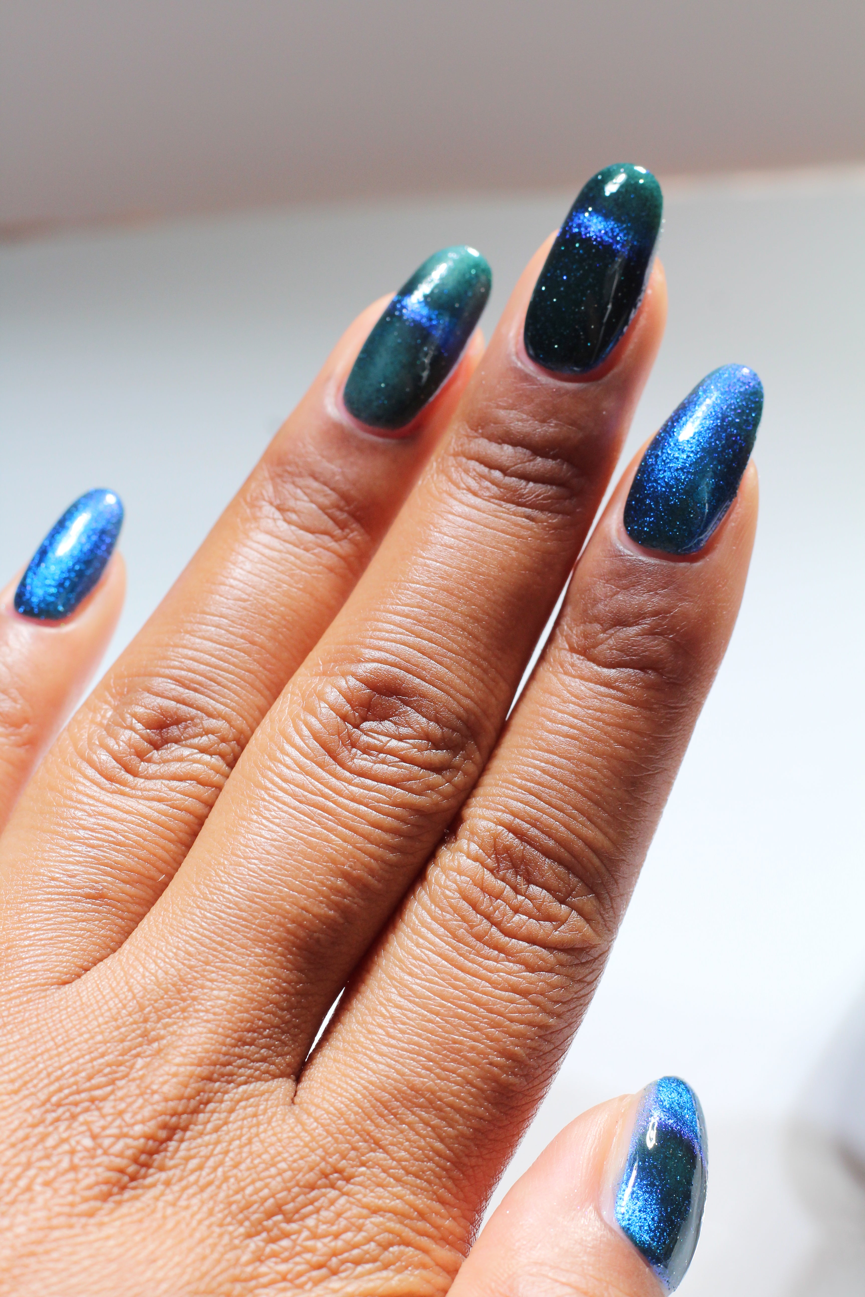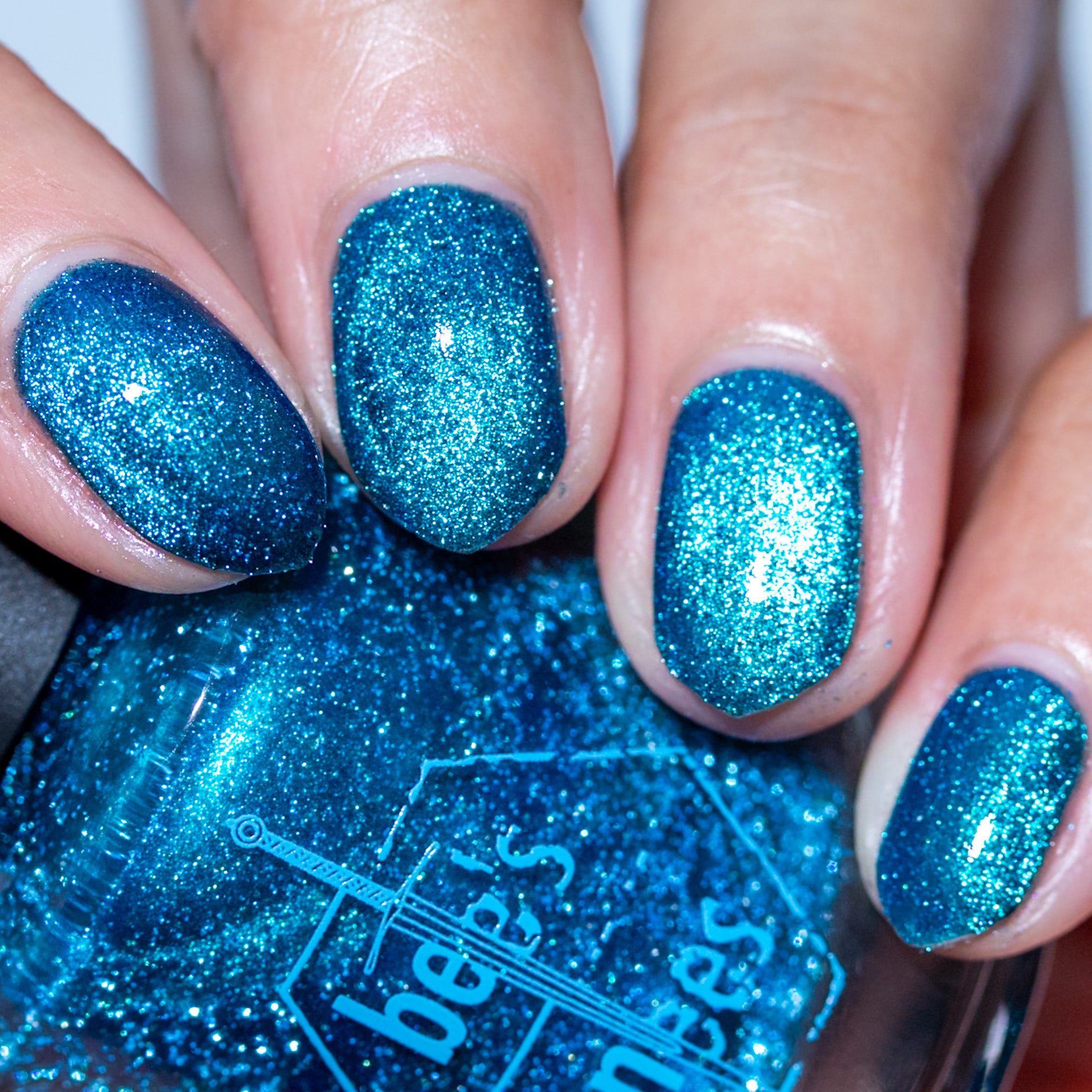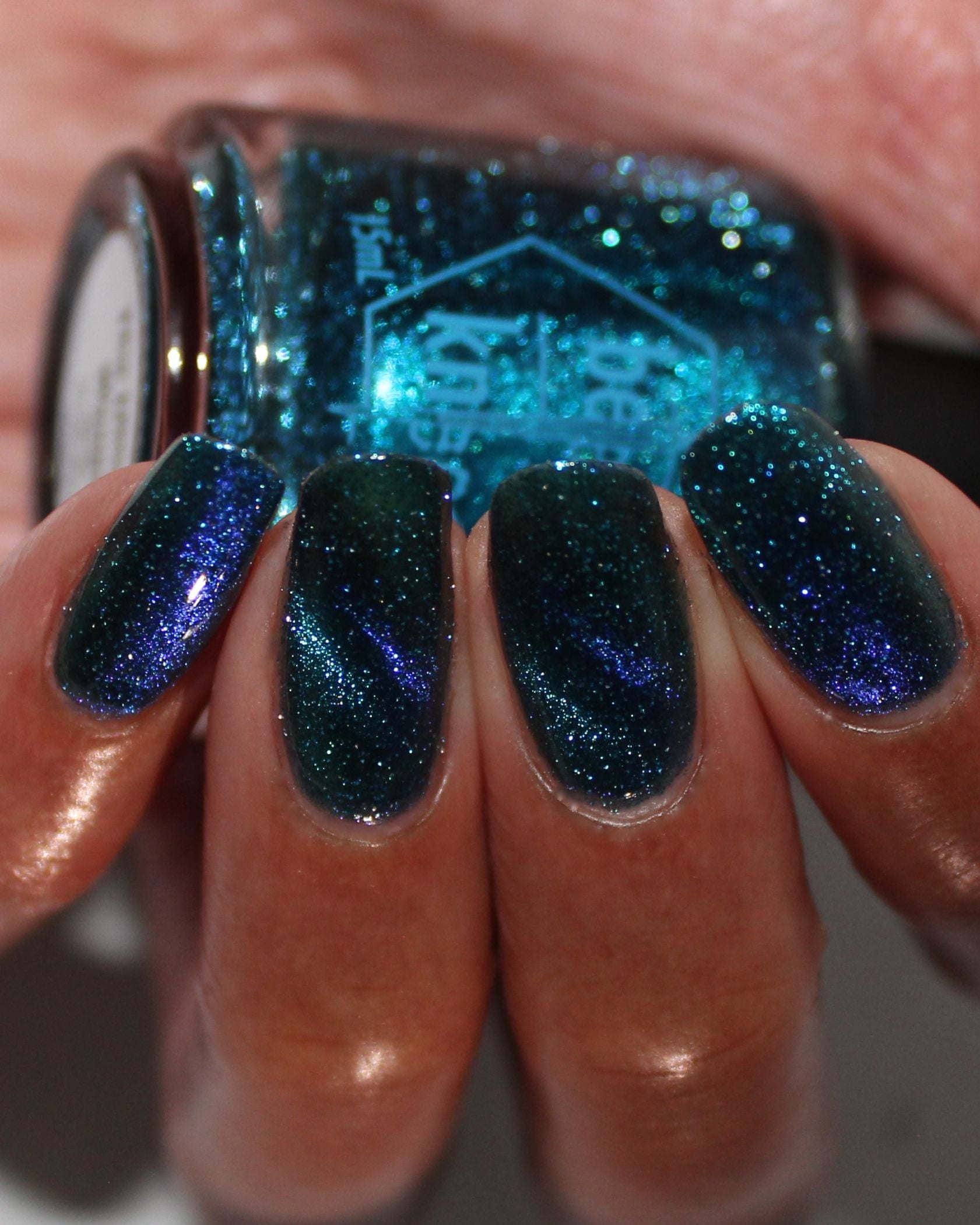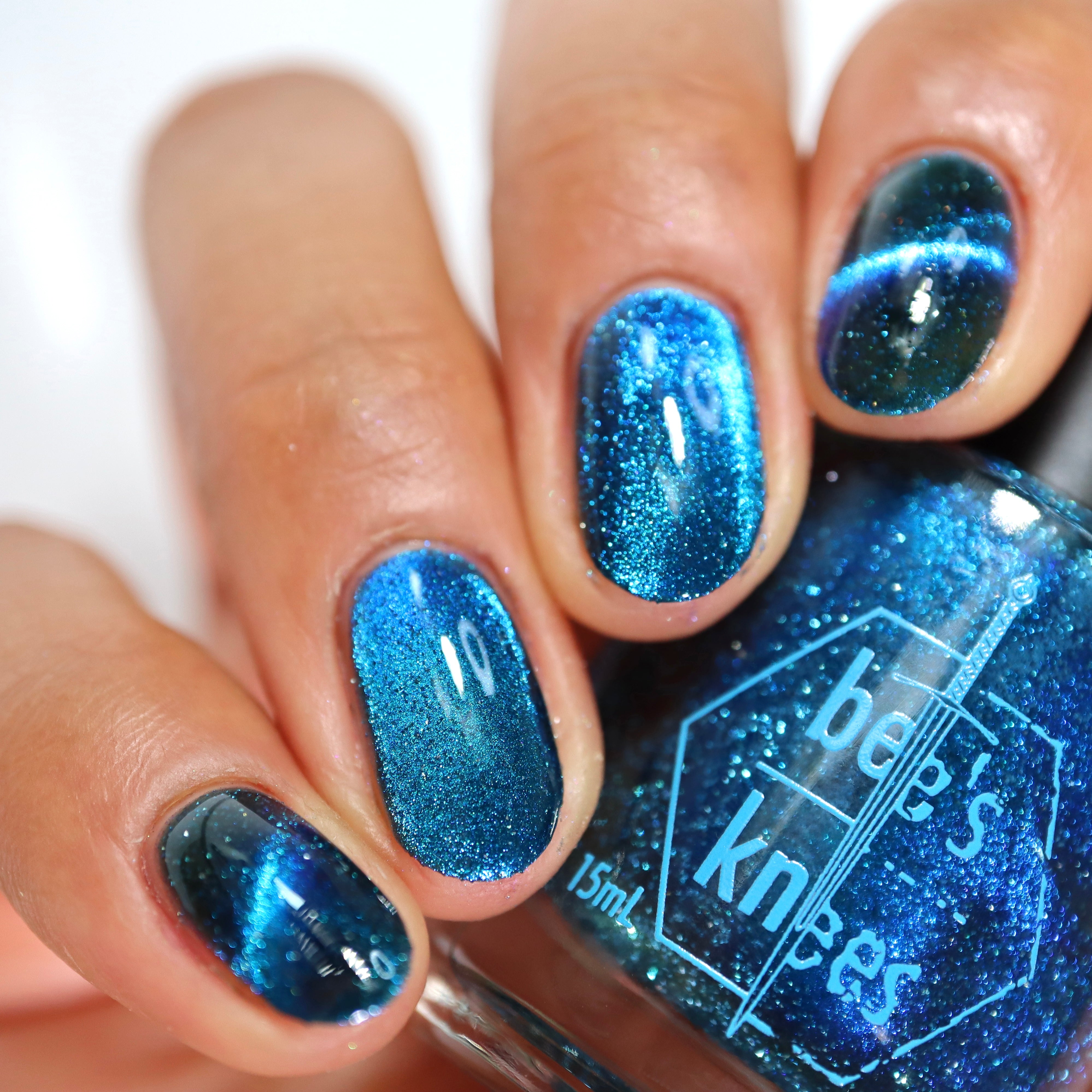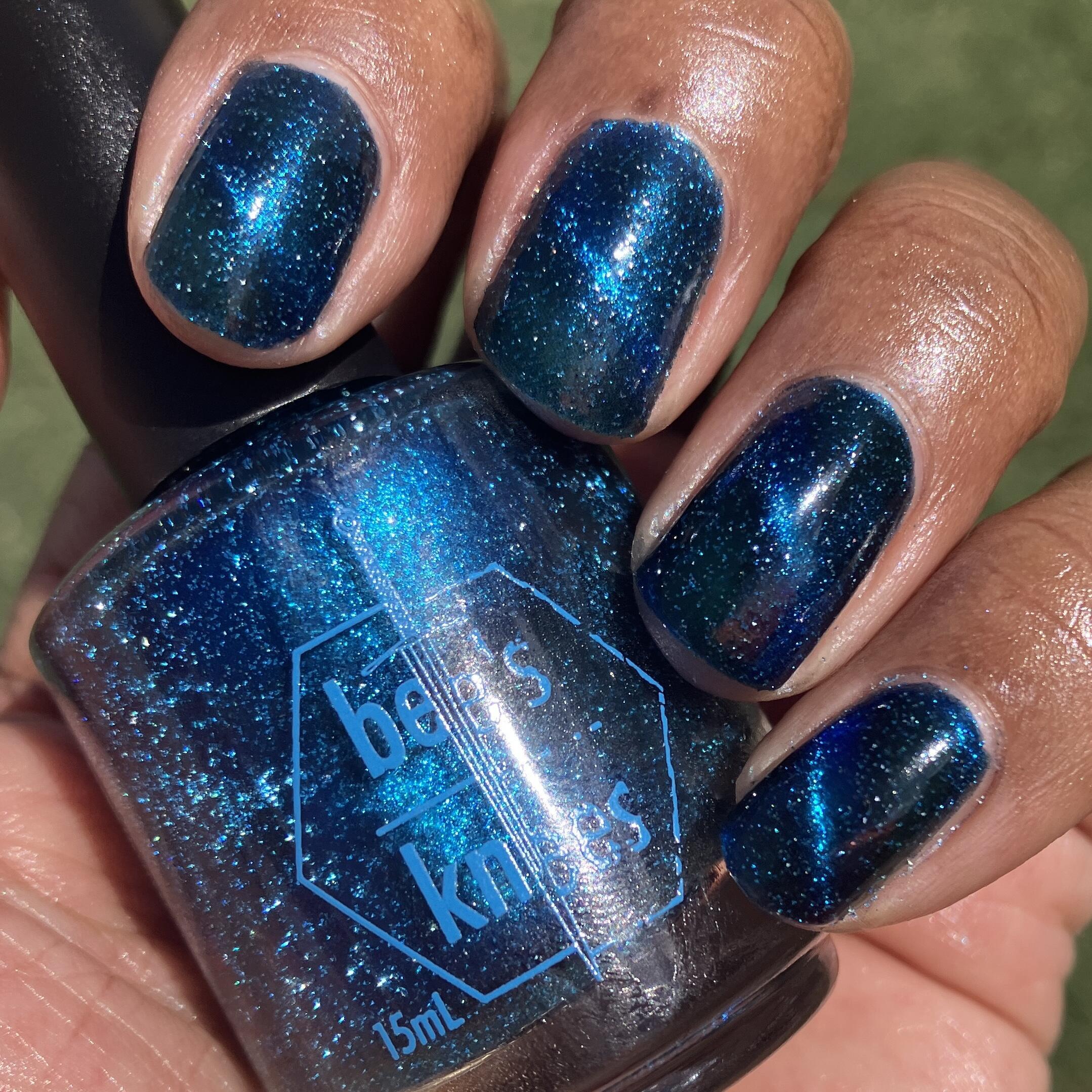 a dark turquoise with glowing blue magnetic shimmer and blue light reflective glitter
