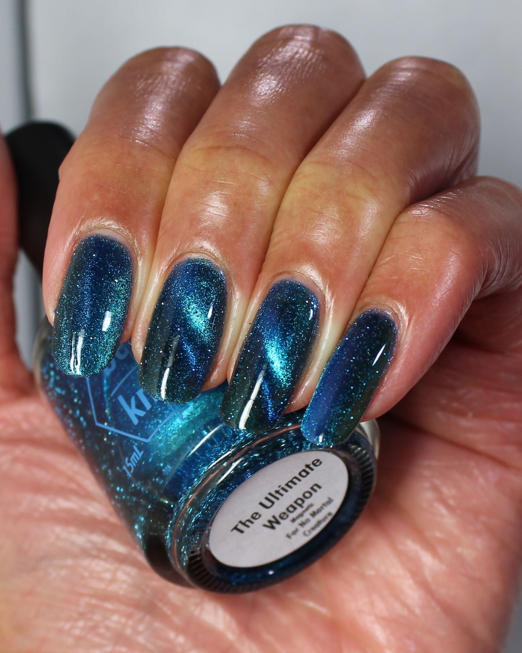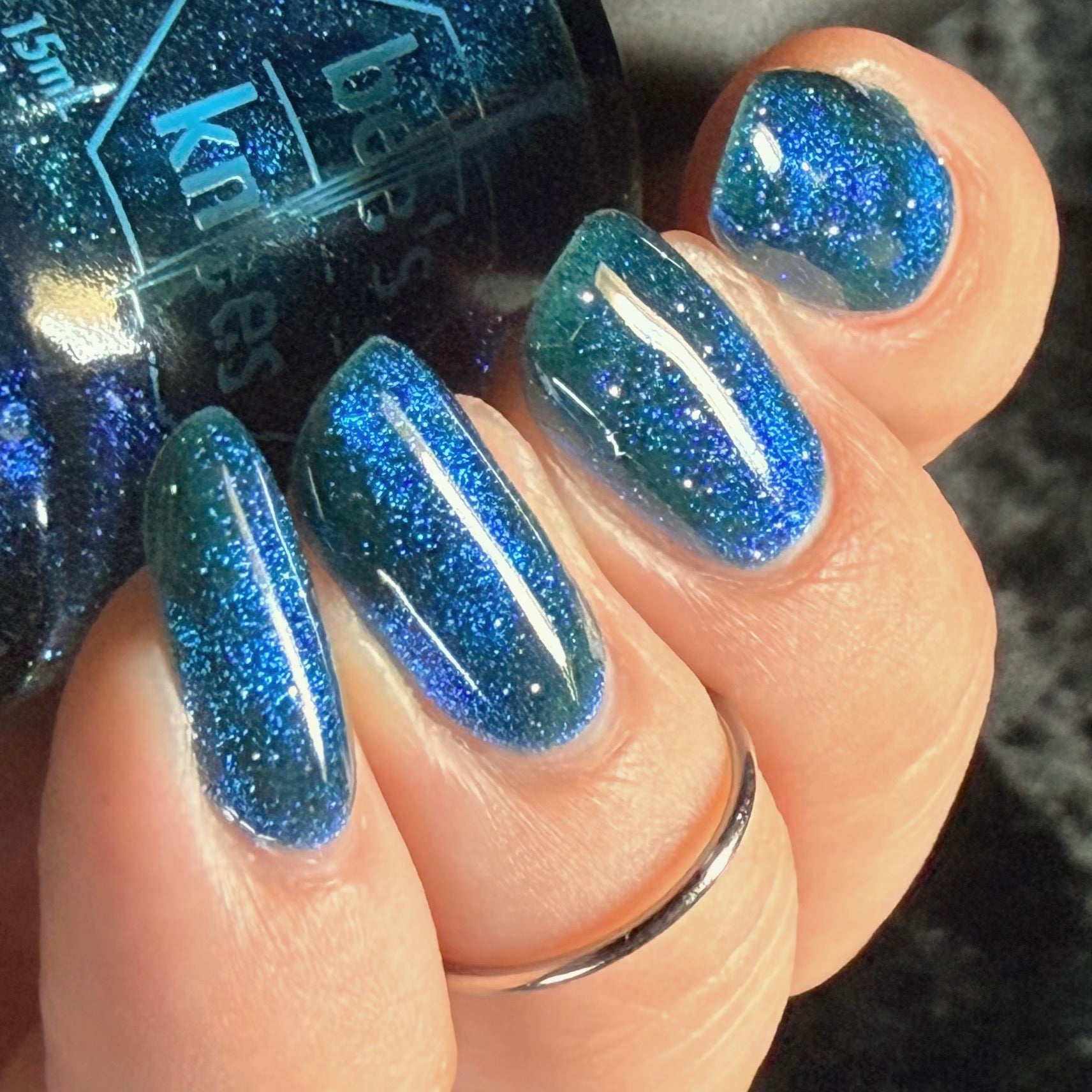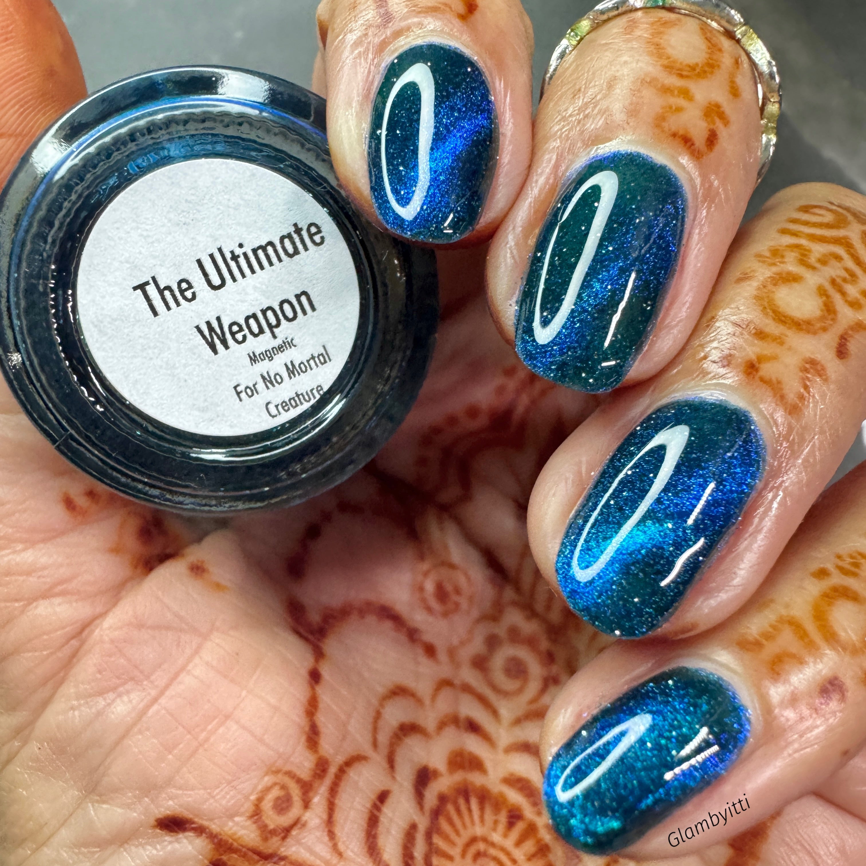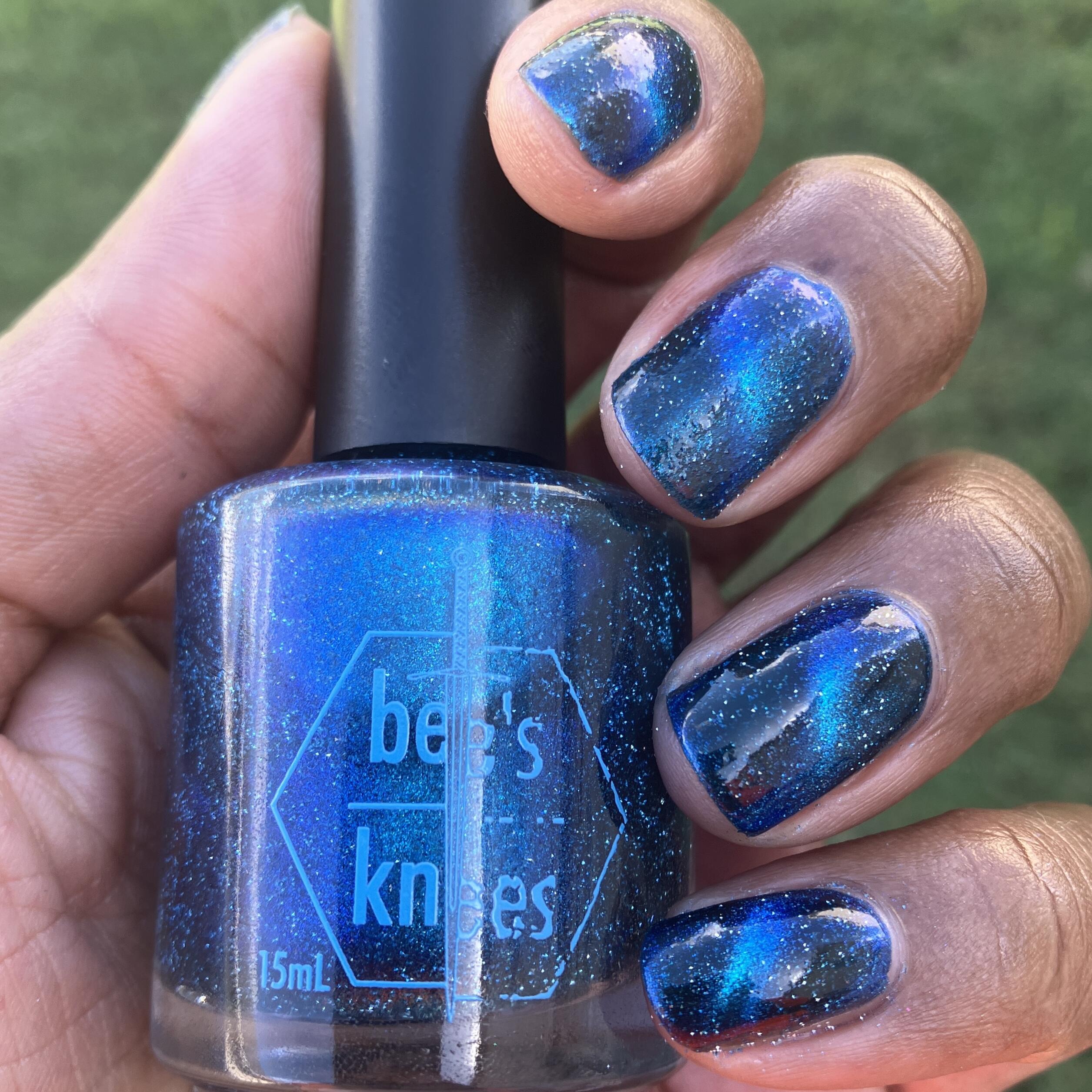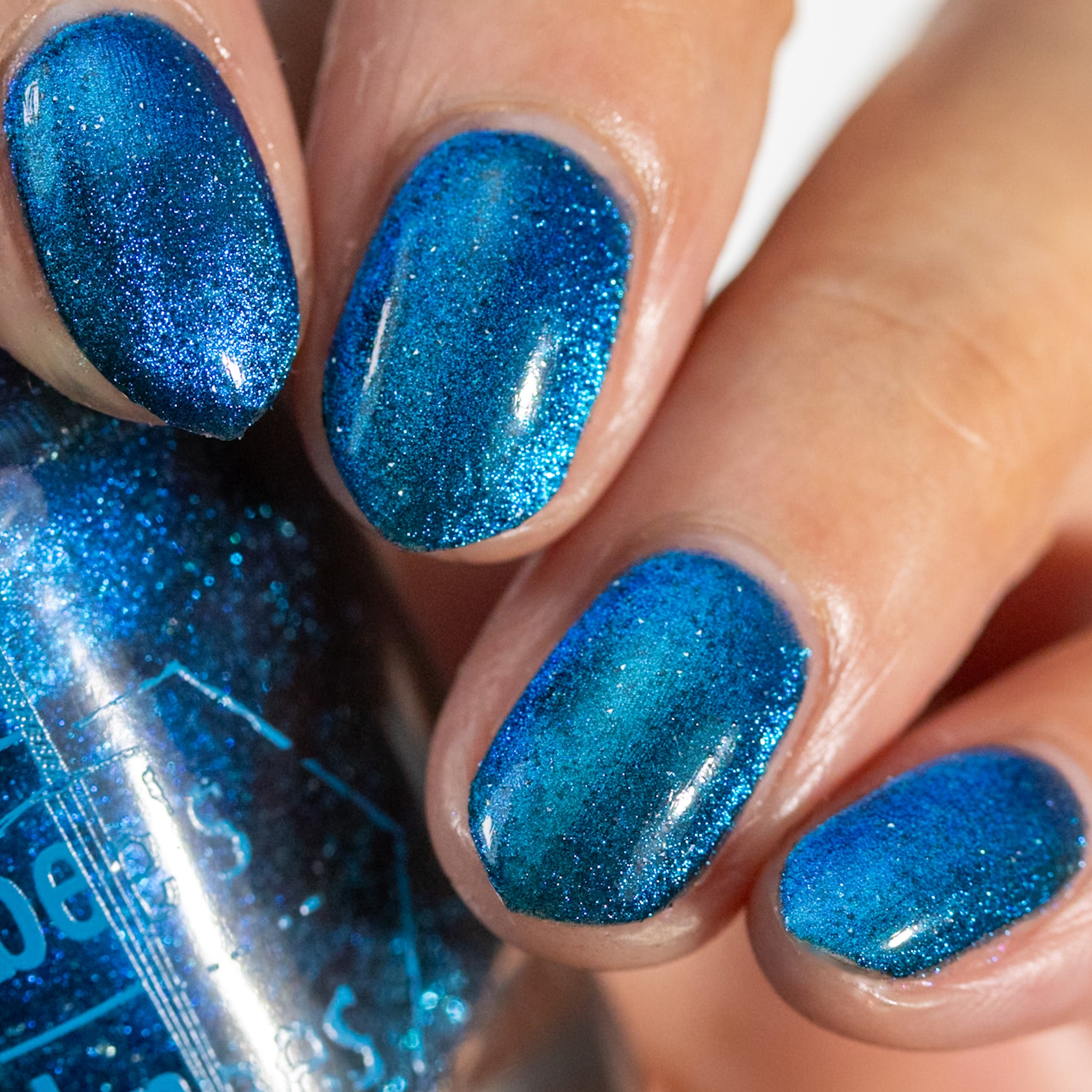 a dark turquoise with glowing blue magnetic shimmer and blue light reflective glitter