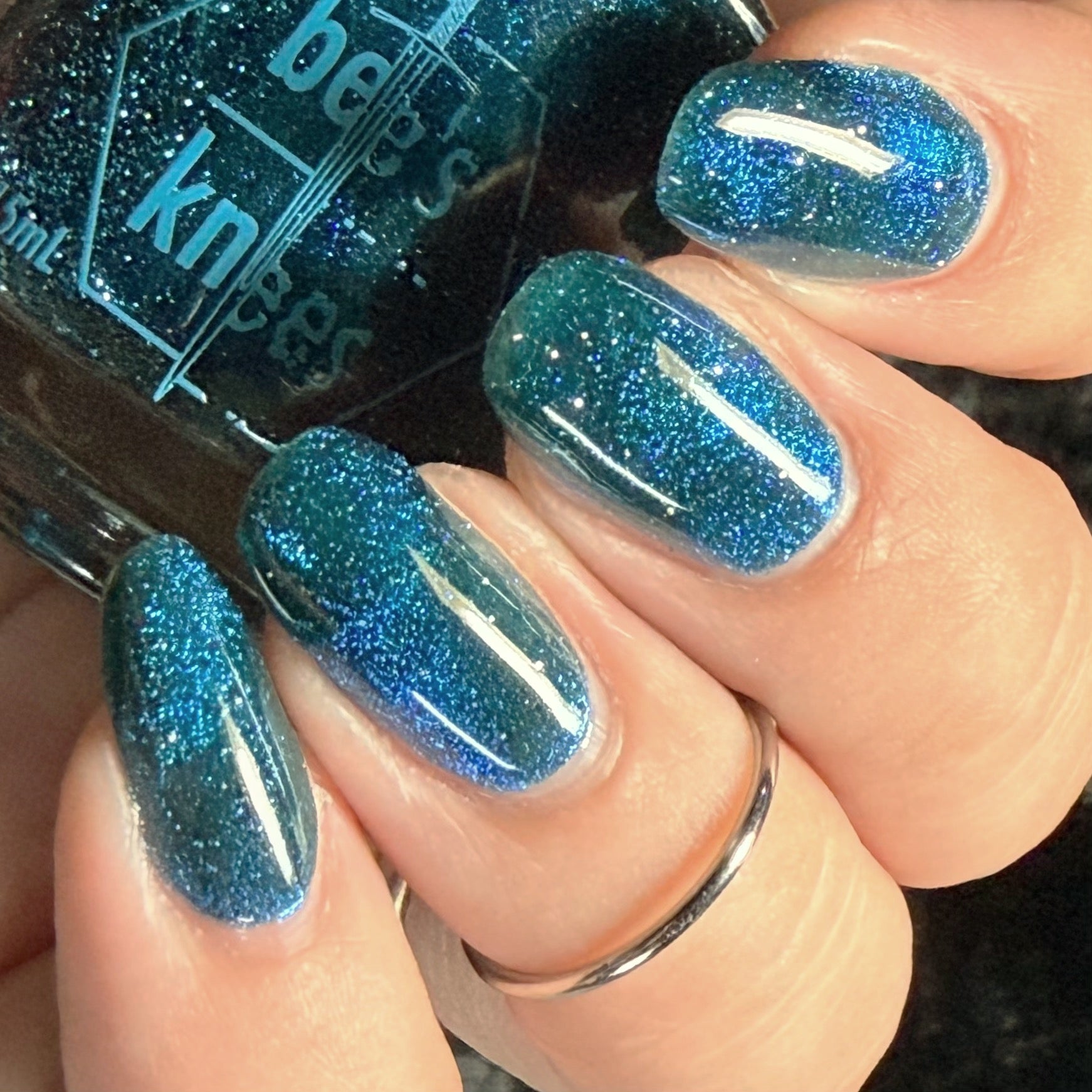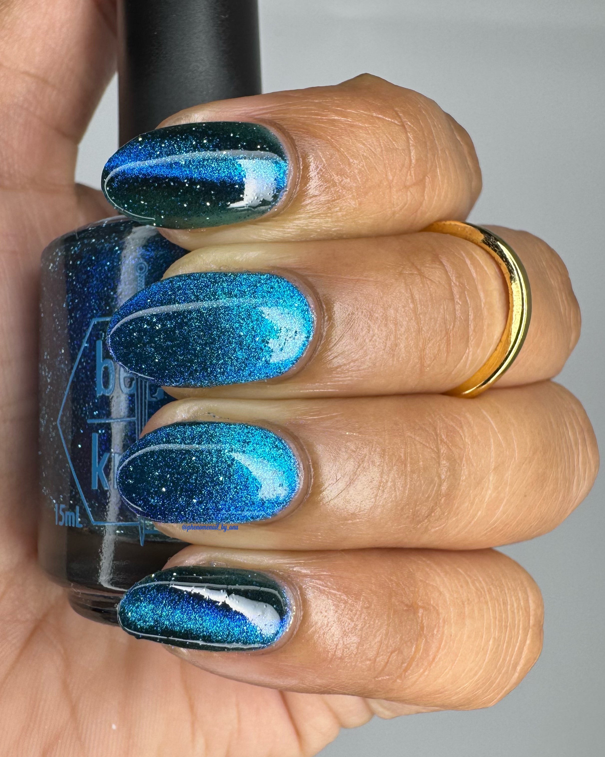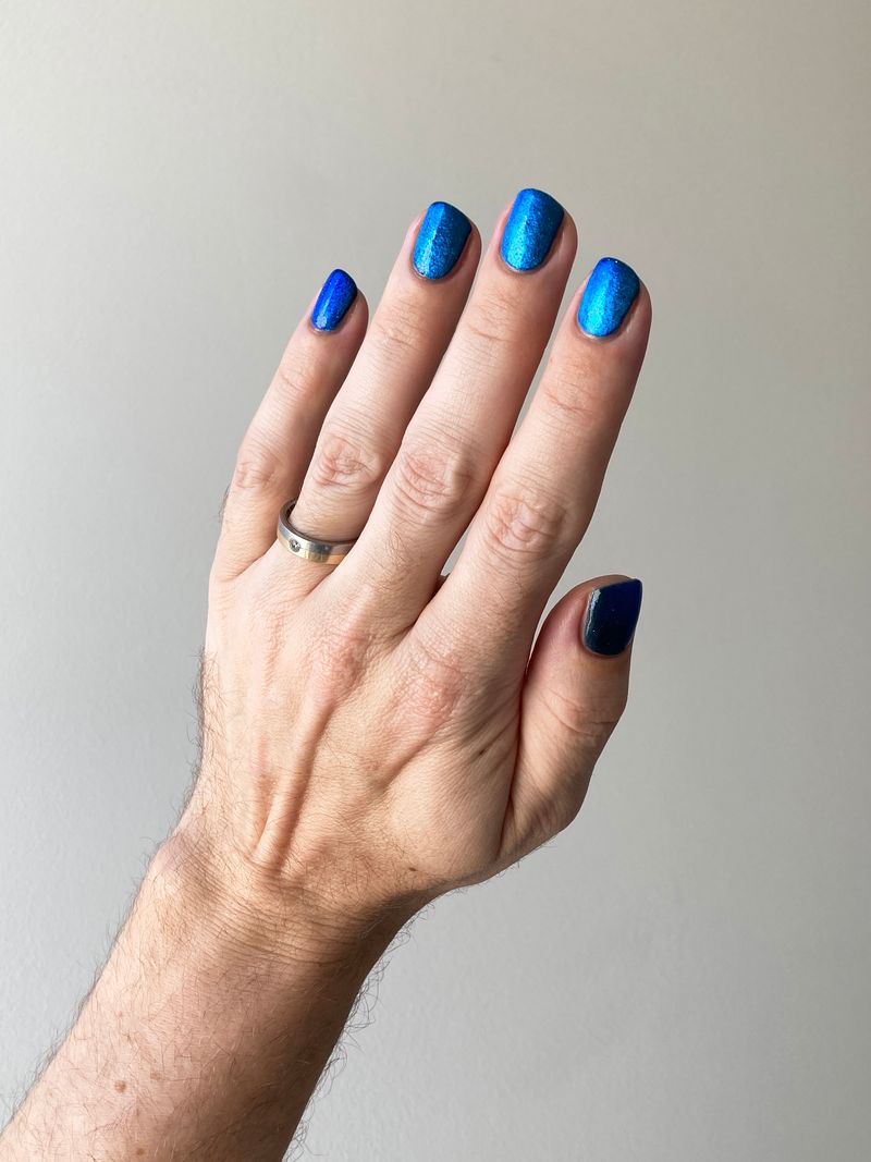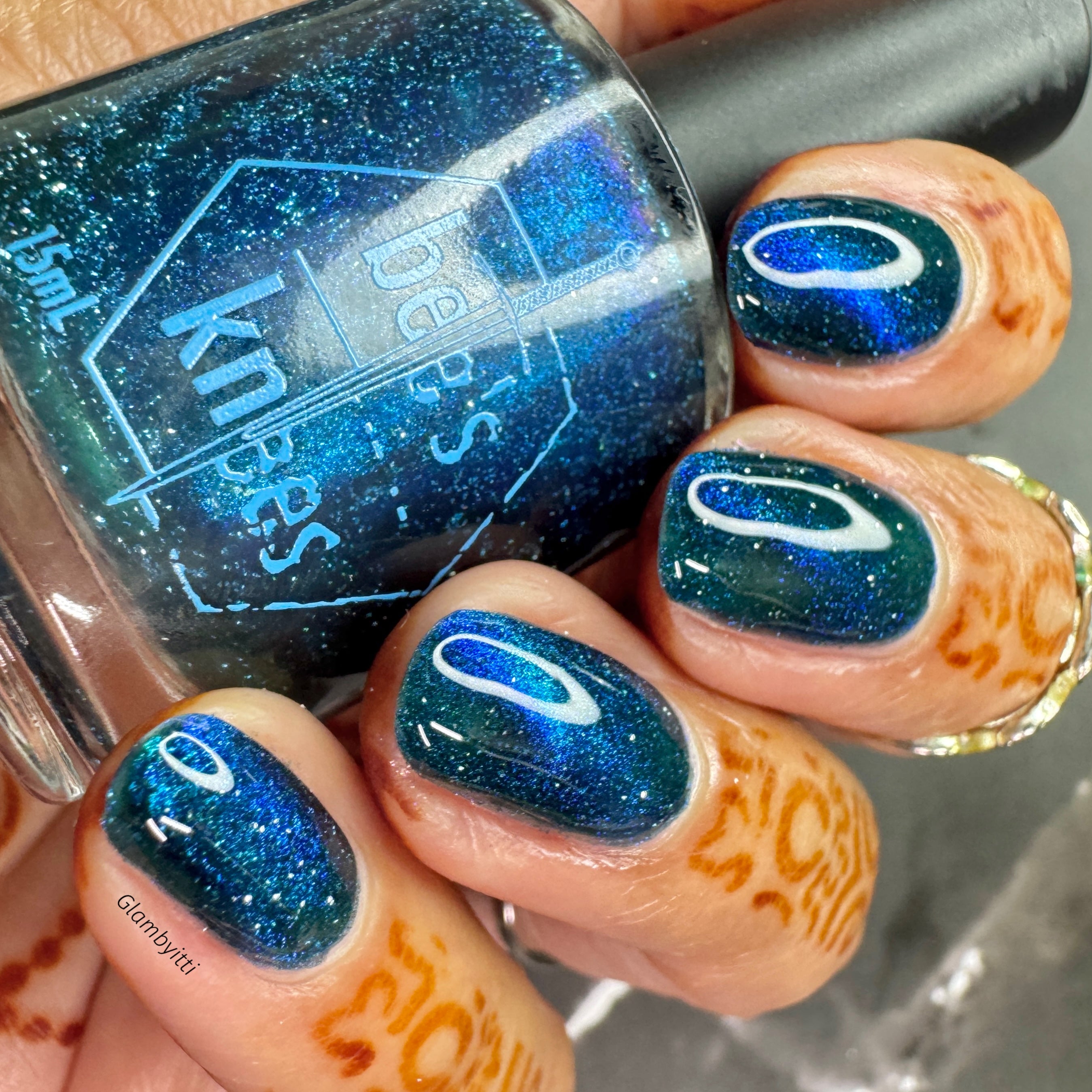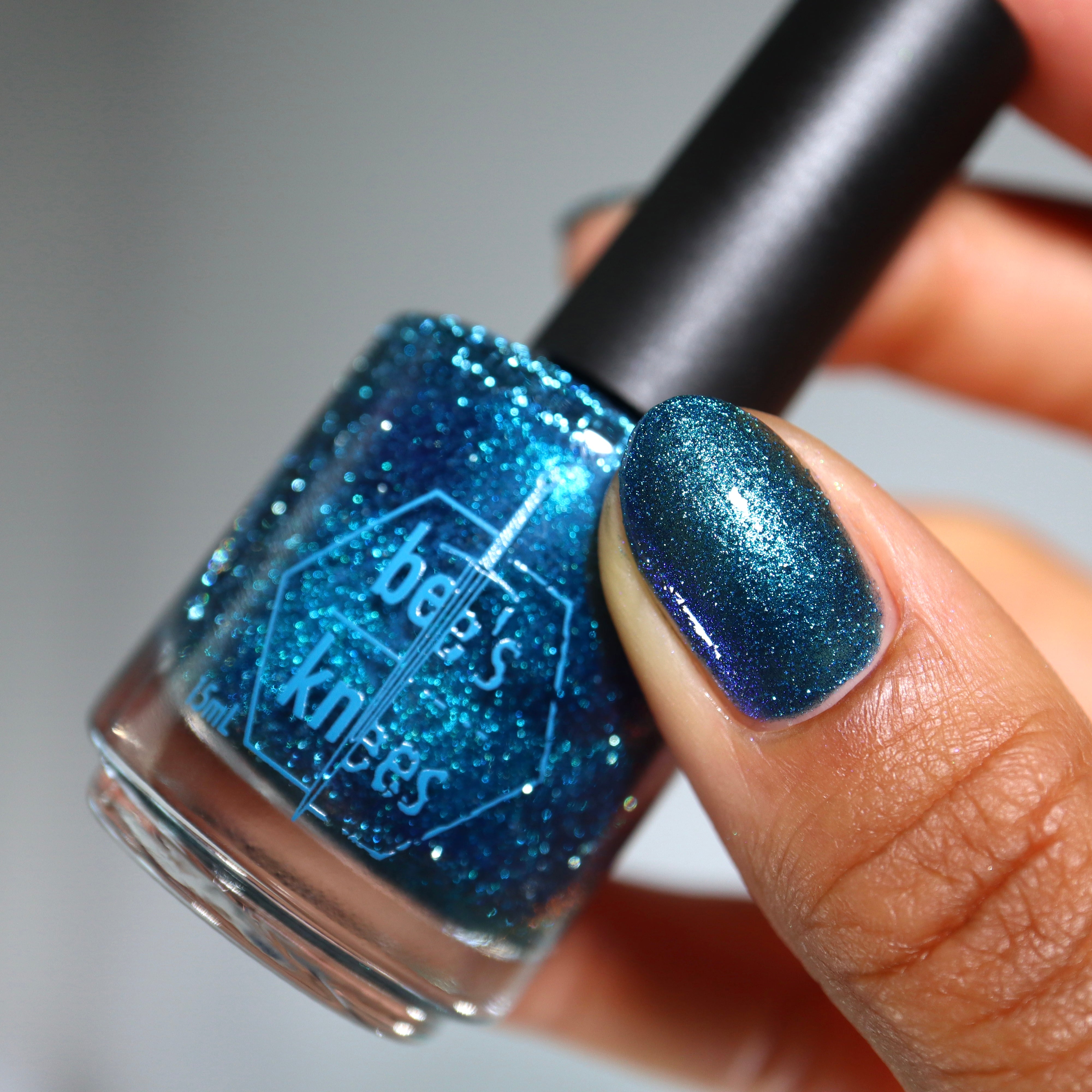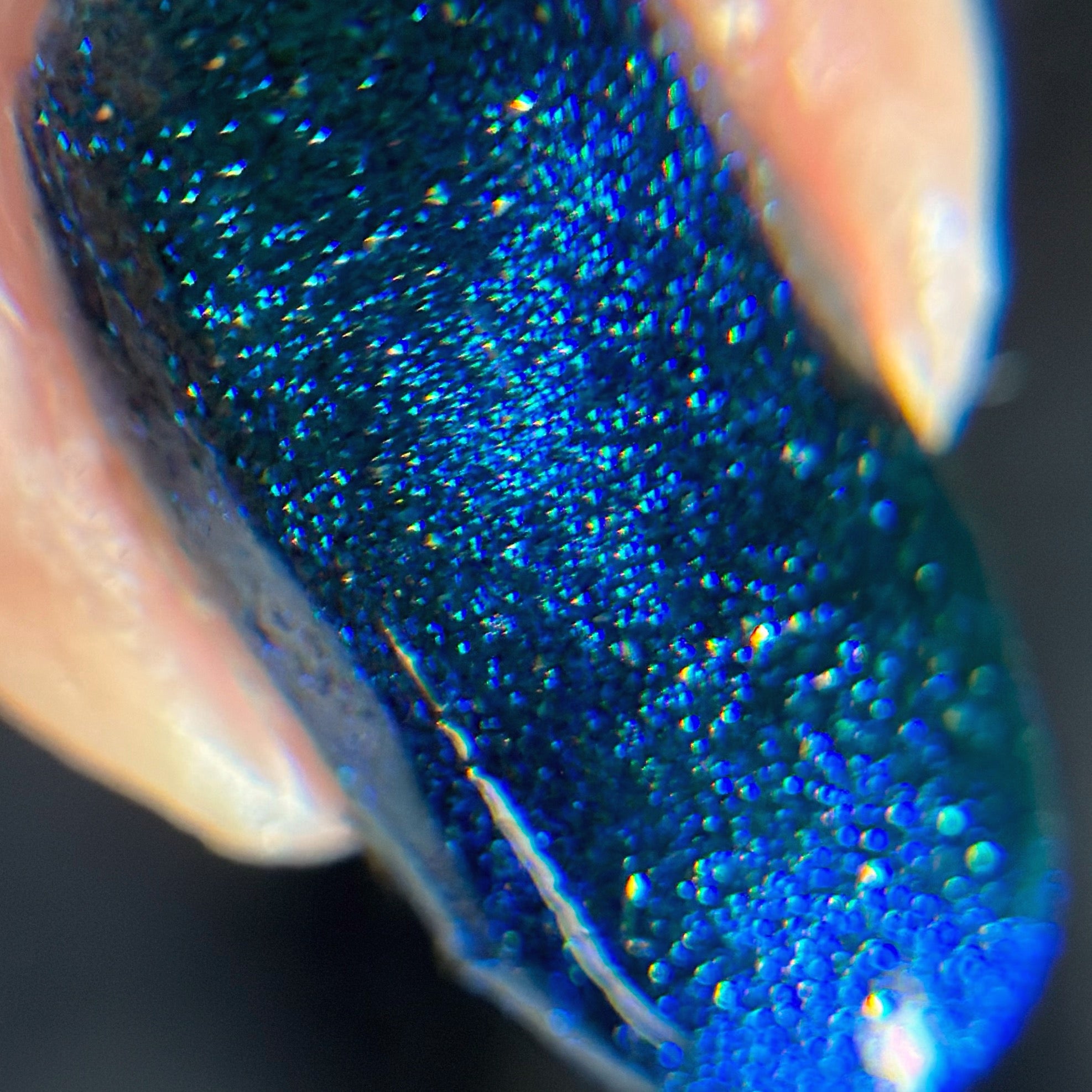 a dark turquoise with glowing blue magnetic shimmer and blue light reflective glitter