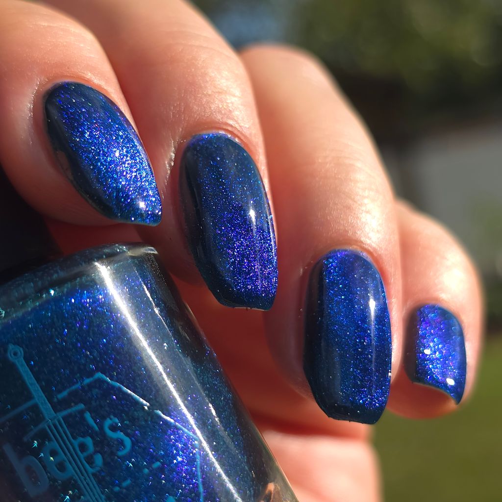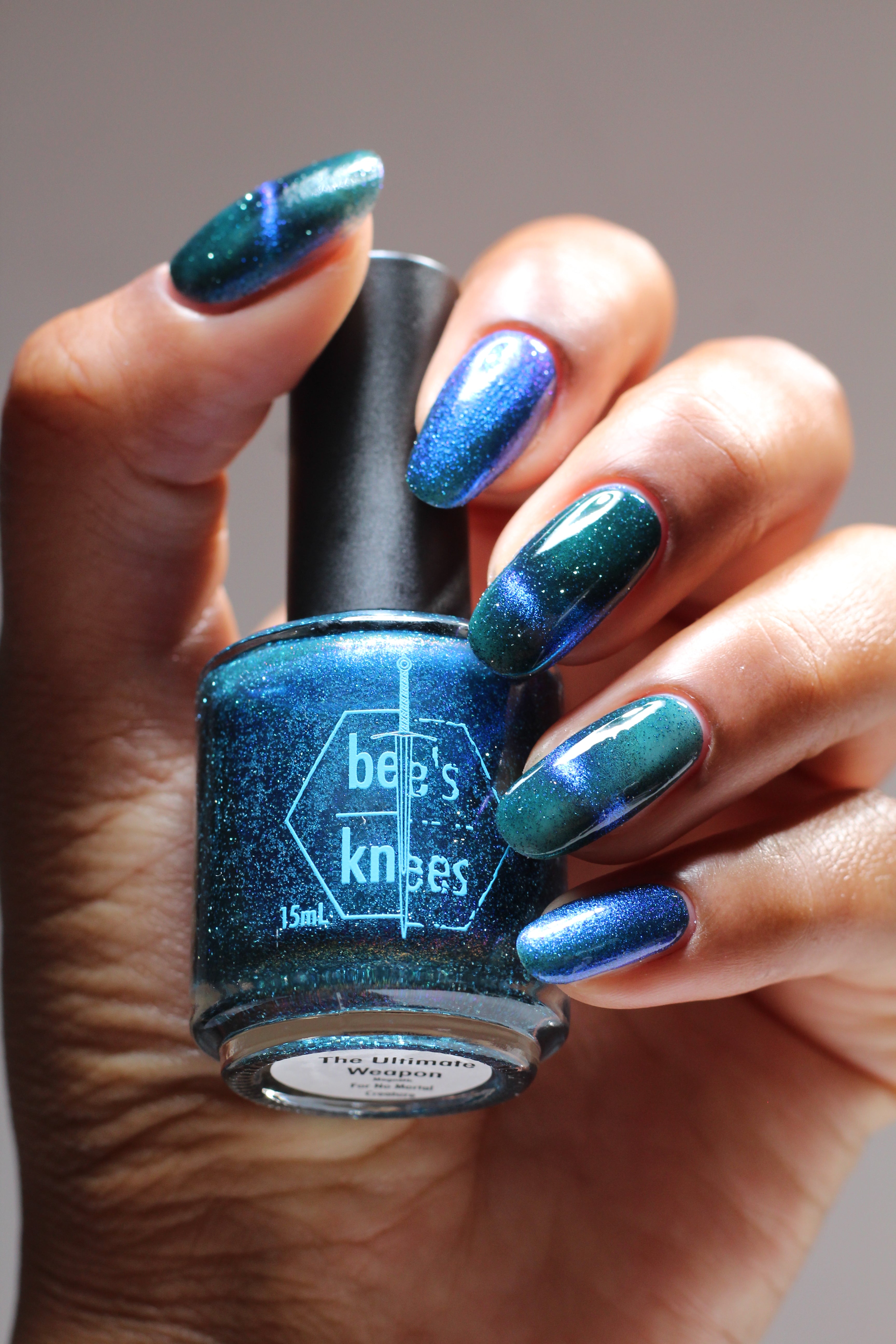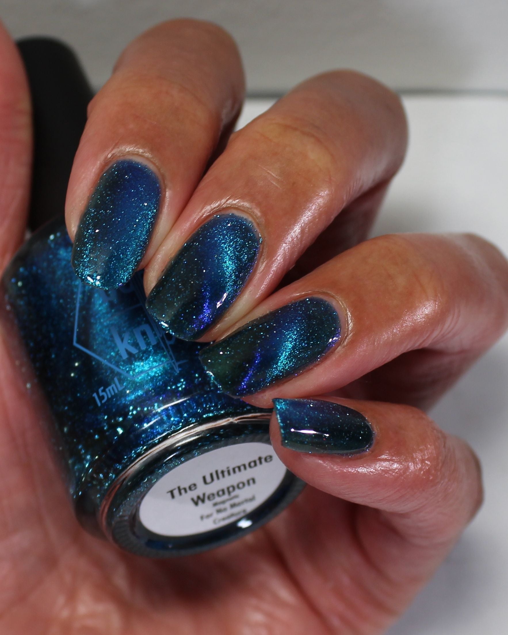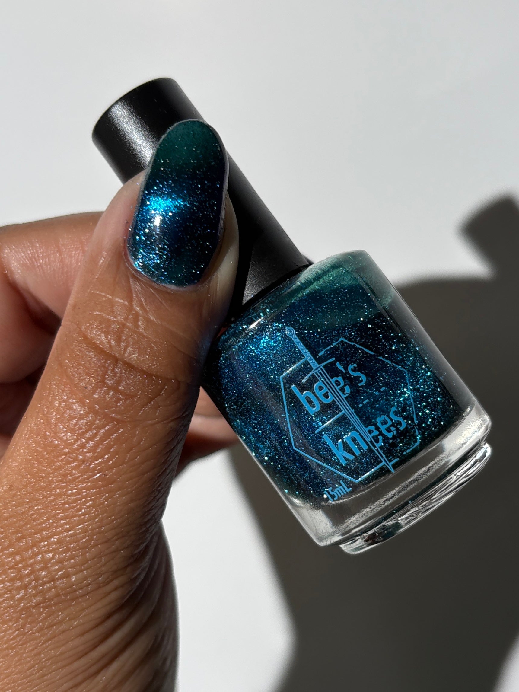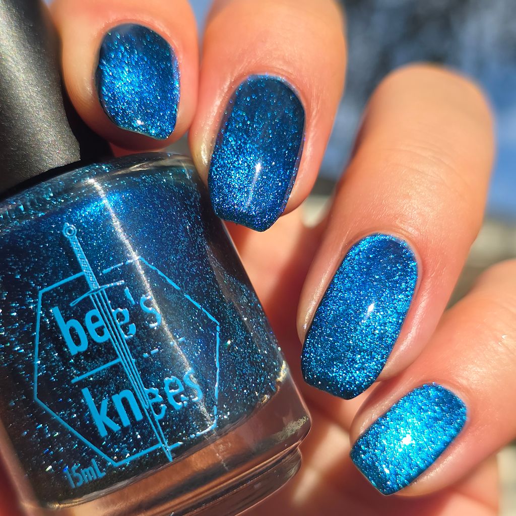 a dark turquoise with glowing blue magnetic shimmer and blue light reflective glitter